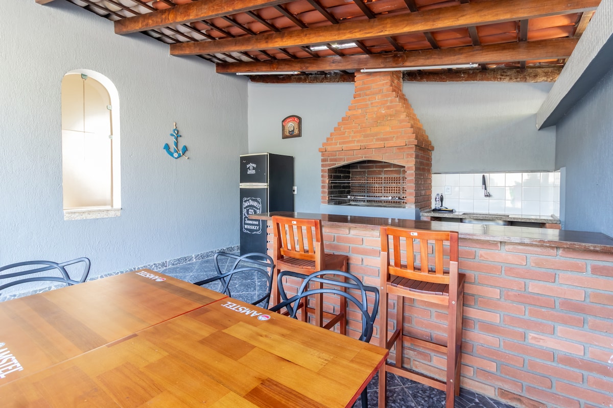 Casa aconchegante com piscina, churrasqueira, forno a lenha e lareira. Localizada no melhor condomínio do Guarujá. A casa está mobiliada e com todos os utensílios domésticos. Ar condicionado em todos os quartos. Todos os quartos são suítes e tem roupa de cama e banho. A casa está localizada próximo a praia, mercado e bares. Portaria e segurança 24hs.