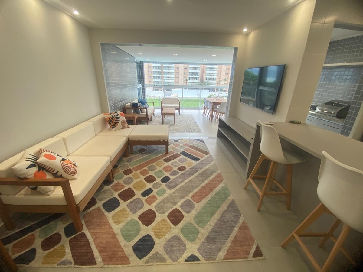 **BEST LOCATION IN GUARUJÁ, DON'T USE YOUR CAR FOR ANYTHING** 90 meters from the BEACH, LUXURY CONDOMINIUM, Air Conditioning, POOL, 2 COVERED PARKING SPACES, BARBECUE, BEACH SERVICE (with chairs and umbrella) **NEW BRAND, POCKET SPRING BOX BEDS, SMART TV** - Living room with 2 areas with sofa bed, 60” SmarTV, Wi-Fi - Suite with 1 double bed + SmartTV + closet - Bedroom with 2 single beds + closet+ balcony - 2 bathrooms - Fully equipped kitchen - Balcony in the living room with table n chairs