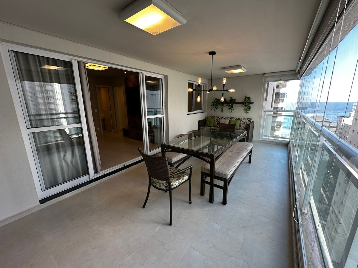 4 Ar condicionados: Sala e 3 quartos , wifi, máquinas lavar roupas e louças e 3 TVs Sala: mesa grande c/8 cadeiras, sofá 3 lugares 2 poltronas e banco Varanda gourmet c/vista parcial p/o mar: churrasqueira, pia, frigobar, mesa p/6 pessoas, 2 sofás 2/3 lugares Cozinha: c/utensílios domésticos Serviço de praia: guarda sol e cadeiras Área de lazer, piscinas, academia, salão de jogos, cinema, sauna, brinquedoteca e máquina de gelo 2 vagas p/carros Tela de proteção todas as Janelas A 50m da praia