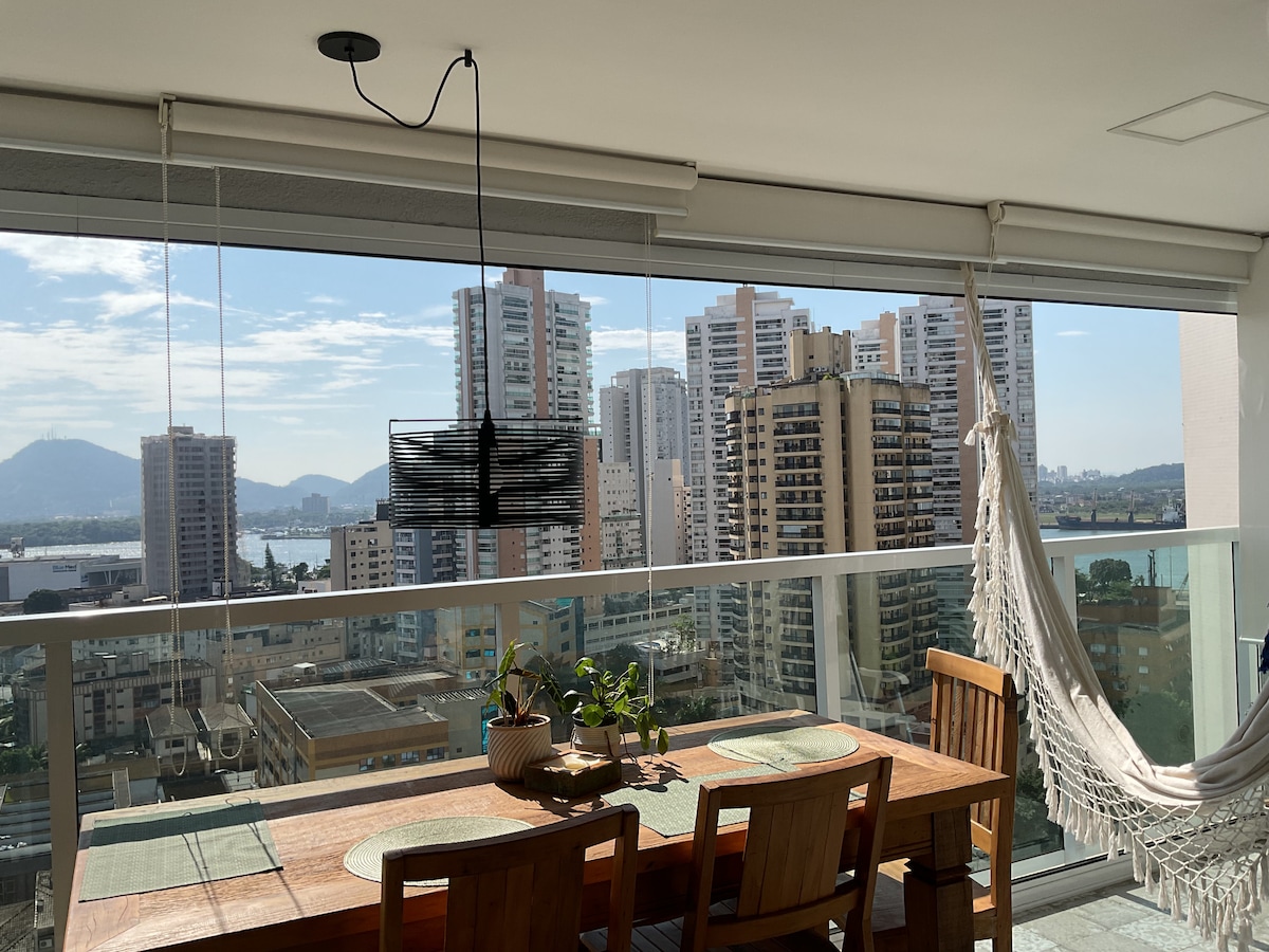 Modern apartment on Aparecida beach. Excellent location, building in front of the beach, close to the bars of channel 5 and the Praiamar shopping mall. On a high floor, with partial sea view, on 3 balconies. Well equipped kitchen (gas grill, microwave, electric oven, cooktop, brewery, wine cellar, coffee makers and dishwasher). Social bathroom. Suite with queen bed, whirlpool and bathroom. Bedroom with 2 king single beds. Mattress/sofa available. Laundry with machine. Air-conditioned.