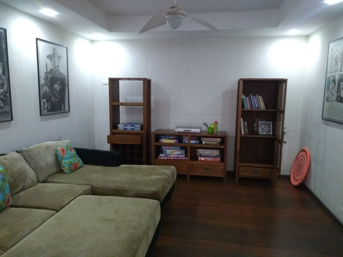 Private suite that is part of the Casa Calú accommodation. We are located on Praia do Pernambuco, which is considered one of the most beautiful in the city of Guarujá. With a unique style surrounded by vegetation and also has the famous Mar Casado. This beach is considered the most touristic in our city, where the famous Hotel/Shopping Jequitimar is located, and where the city's main shows take place. Casa Calú has simple, beach-style decor.