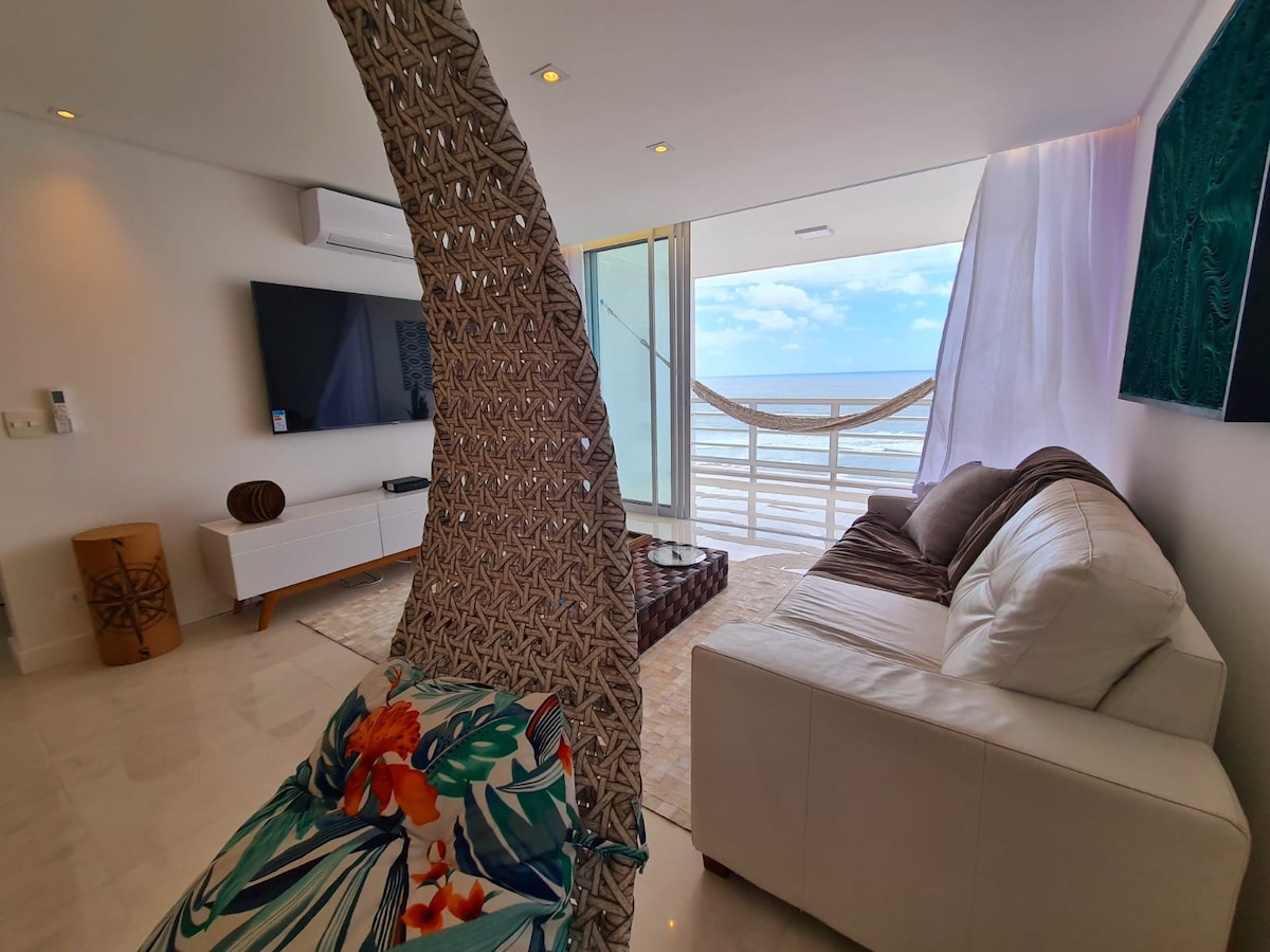 Pé na areia, frente total para o mar com varanda: som das ondas, pássaros, paisagem de tirar o fôlego com vista espetacular. Esse é um apartamento da grife "The Perfect View" -- sempre vistas perfeitas com estilo. A varanda é integrada com uma ampla sala, com vista para o mar. Decorado com design exclusivo oferecendo experiencia única para relaxar ou trabalhar à distância -wi-fi de alta velocidade , ar condic. em todos os cômodos, smart TVs e home office. Uma vaga na garagem com manobrista.