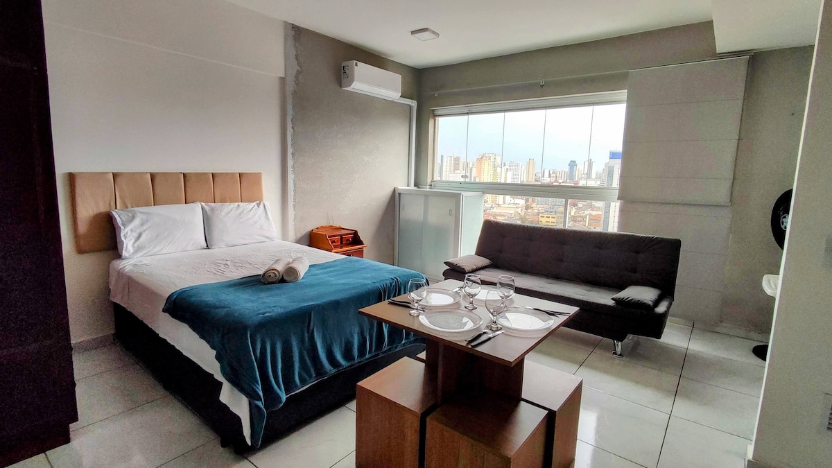 Studio com Ar Condicionado no centro de Guarulhos, ao lado da saída para a Dutra sentido Rio ou SP. Conta com todo conforto e comodidade de sua casa, com linda decoração pensado para curtas ou longas estadias Perfeito para família até 4 pessoas, pessoas viajando sozinhas a lazer/trabalho. Estrutura para até 4 pessoas (cama casal)e sofa cama. Mercados, Farmácia, padaria, nas redondezas. Para quem vem de carro, temos vaga =) Studio a 11 minutos de carro do aeroporto internacional de Guarulhos-GRU.