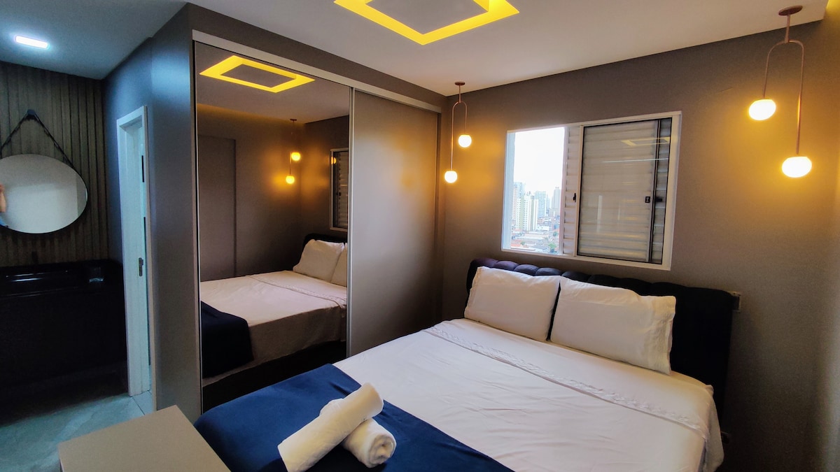 Studio moderno e luxuoso no Gran Maia Giardino, em Guarulhos. Ideal para curtas ou longas estadias. Acomoda até 03 pessoas com cama Queen e sofá-cama (crianças) Cozinha equipada, ar-condicionado, sistema de som Bluetooth. Condomínio com piscina, academia, playground, brinquedoteca, lavanderia, pet friendly, mercadinho 24h e estacionamento gratuito. Localização central privilegiada, fácil acesso às principais vias da cidade, a 7 km do Aeroporto GRU e próximo a shoppings, farmácias e restaurantes.