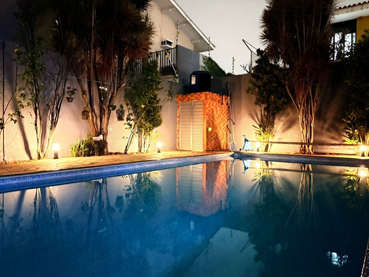 Relaxe com toda a família nesta acomodação tranquila. Nosso espaço dispõe de uma grande piscina com área mais rasa para crianças, 3 suítes que acomodam até 15 pessoas, estacionamento para 8 carros, área verde gramada para jogar bola. Wiffi disponível. Amplo salão com cozinha equipada, varanda com ganchos para rede. Próximo da natureza e também da cidade, localizado próximo ao bairro do Bonsucesso, em Guarulhos. Venha curtir seu final de semana conosco nesse ambiente aconchegante