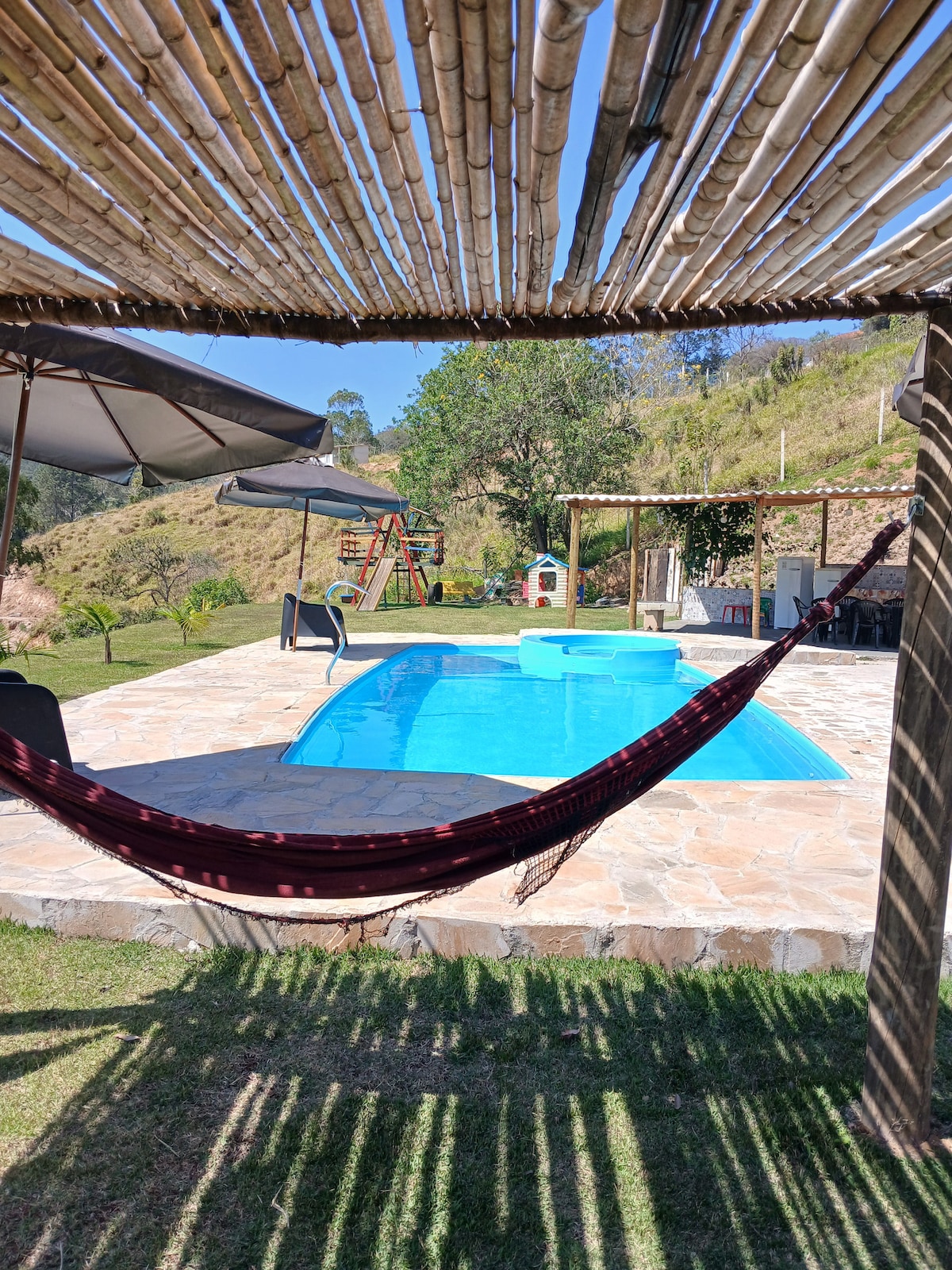 Informações da Chácara: - Piscina de vinil: 7m de diâmetro x 1,40m; - Área Gourmet com churrasqueira; - Estacionamento fechado para 02 carros; - Lago com peixes. Regras: - Necessário envio de documentos de TODOS os hóspedes após reserva. - Piscina: permitida c/roupas s/botões, metais. Proibido: bijouterias e piercing; Proibido beber, comer e fumar dentro da piscina; - Fumar: permitido somente nas varandas e áreas externas; - Pescar: permitido lambaris e traíras; "Ficará sempre 2 pessoas na casa"