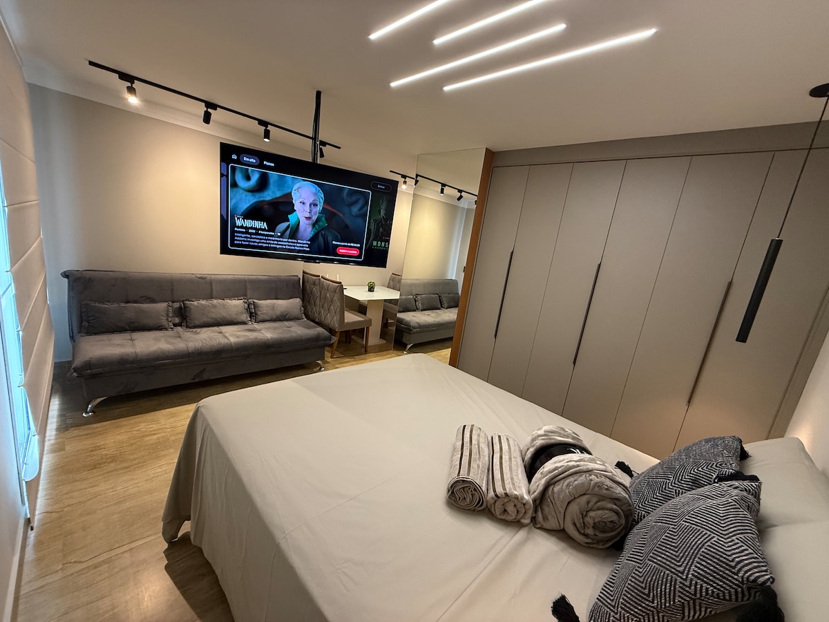 Lindo studio novo, aconchegante, mobiliado e decorado por arquiteto, andar alto com uma linda vista. Roupas de cama e banho devidamente higienizado, prédio com portaria 24h, área de lazer completa no rooftop. Vaga de garagem coberta. Repleto de comércios, shopping, hipermercados, parque, restaurantes e bares.
