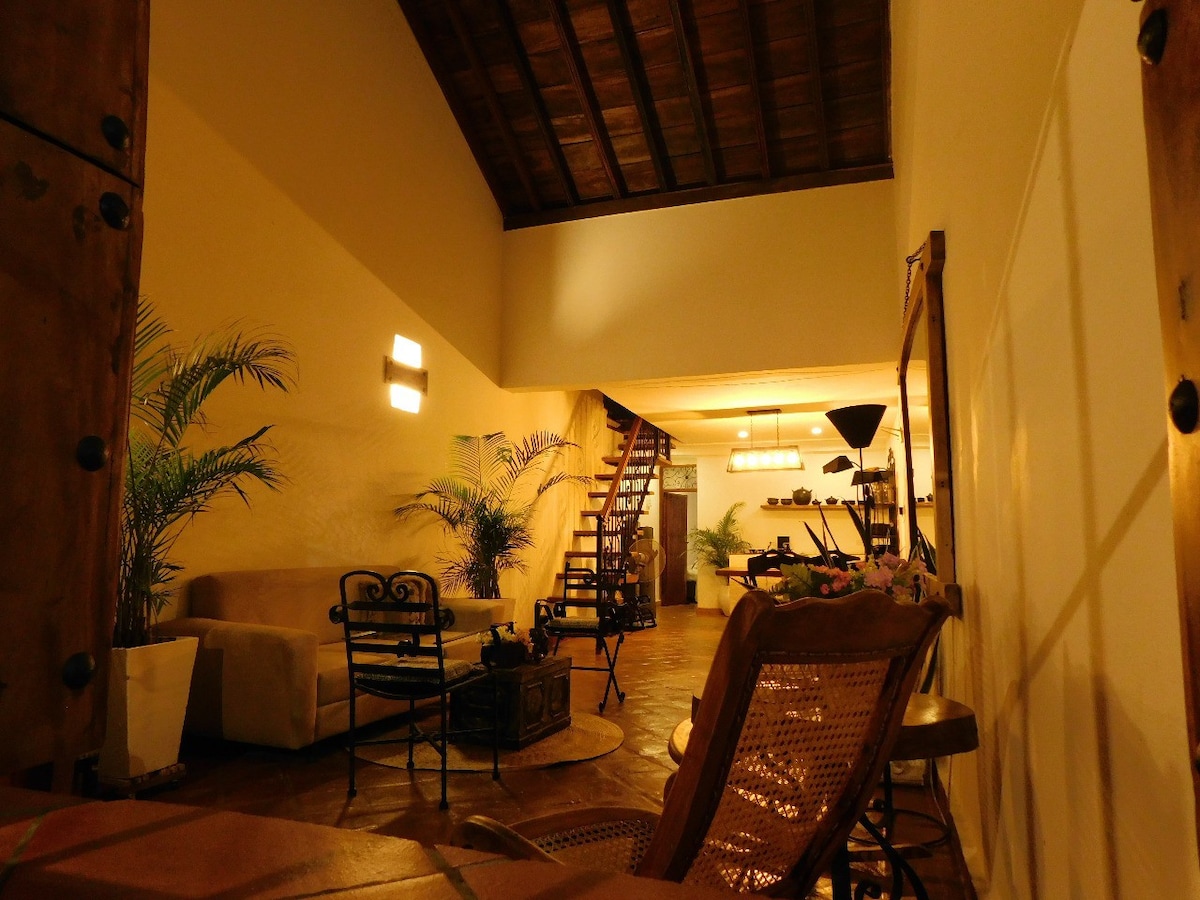 Fresca casa colonial, localizada dentro y cerca de todo lo interesante. Para que en Mompox, camines y sientas el calor de sus calles, iglesias e imponencia y belleza de su arquitectura; también para que descanses, leas, degustes su gastronomía y goces de la cultura, tradiciones y amabilidad de su gente. Cien metros cuadrados, dos baños, cocina, comedor, una habitación hasta para 4 personas, sala amplia, aire acondicionado, ventiladores, 2 TV de 50 pulgadas, wifi, mecedores momposinos, y hamacas.
