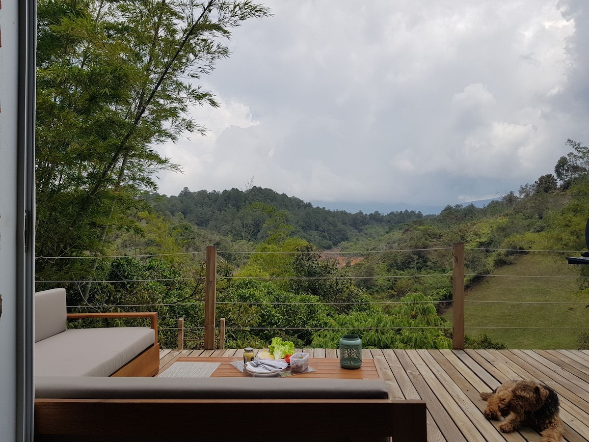 Especialmente diseñada para relajarse y conectar con la inmensidad del paisaje, rodeada de jardines tropicales.Contamos con: ↟☗↟ *excelente vista. *Deck. *Hamaca. *comedor exterior. *fogata. *BBQ. *buen Wifi. *cocina completa *zona de trabajo.