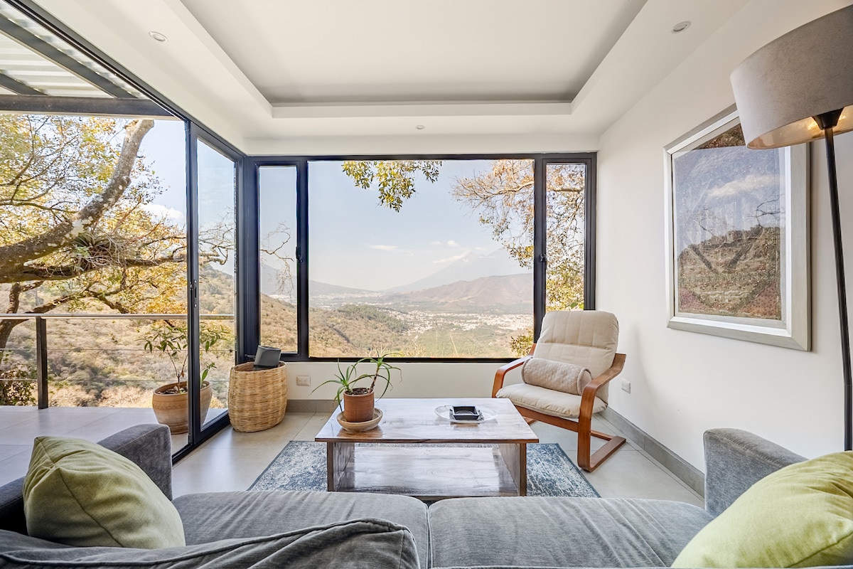 Es una cabaña / casa rodeada de naturaleza , árboles y flores . Cuenta con una vista espectacular a los volcanes y bosques. Cuenta con amplio estacionamiento y un jardín de media manzana . Camino al Hato en donde encontrará muchas amenidades como Hobbitenango, Earth Lodge, Antigua Boreal entre otras . Estamos en el inicio de toda la franja turística. La casa cuenta con todo lo necesario para cortas y largas estancias. Se pueden realizar caminatas . seguridad 24/7.