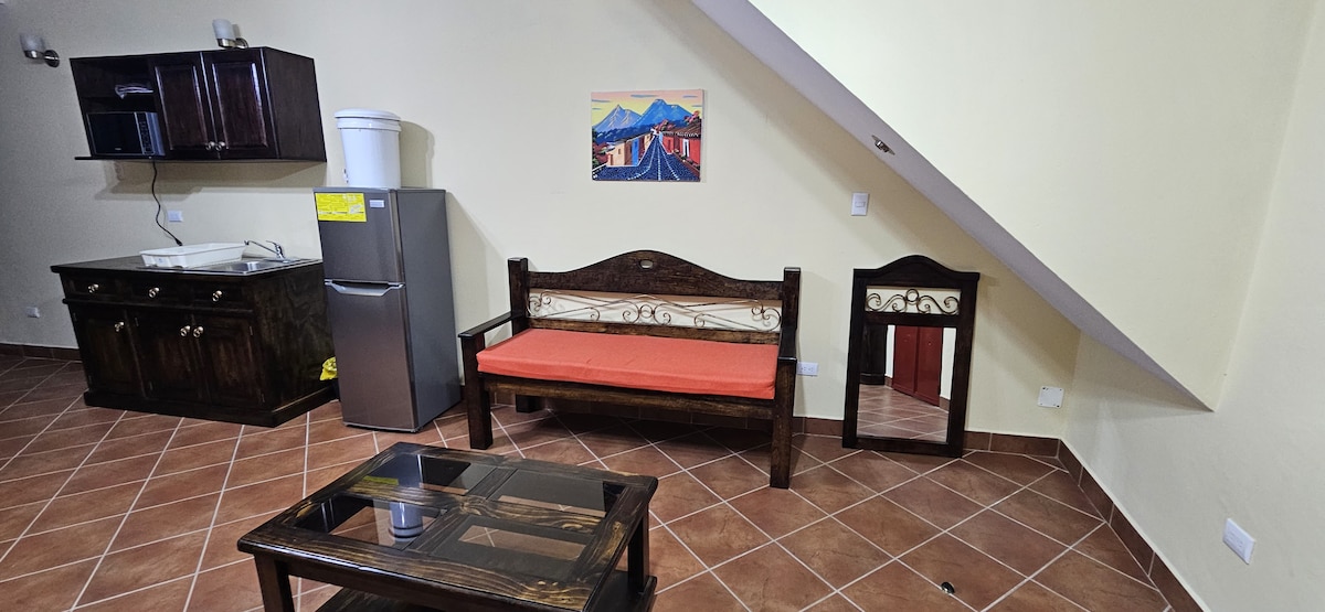 Es un apartamento que cuenta con vista al volcán de Fuego y Acatenango ubicado a 3 cuadras del parque central de San Miguel Dueñas, y a 15 minutos de la Antigua Guatemala. tiene una habitación privada con una cama Queen , un baño con agua caliente, una habitación con una litera para niños. La puerta de entrada está sobre el callejón