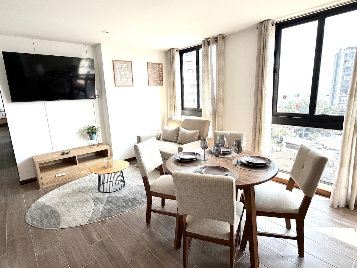 Apartamento entero y moderno. Cuenta con 2 balcones, 1 habitación con cama Queen y baño privado, sala con sofá cama, comedor, cocina totalmente equipada, lavadora y secadora de ropa. Con 2 smart TV de 42” para entretenimiento y wifi . Incluye 1 parqueo gratuito en las instalaciones. **El edificio cuenta con Supermercado y restaurantes**