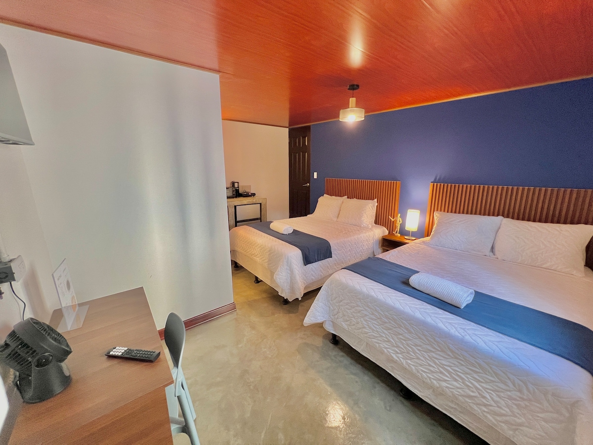 Perfecta ubicación alrededor de restaurantes, comercios, un lugar donde podrás descansar tranquilamente. La habitación está ubicada en el tercer nivel. Hay que subir gradas no hay elevador. Cuenta con dos camas Queen, baño privado con agua caliente, toallas jabón y shampo. Puedes utilizar las áreas sociales del hotel (salas, terraza, comedor) Se tiene derecho a un parqueo.