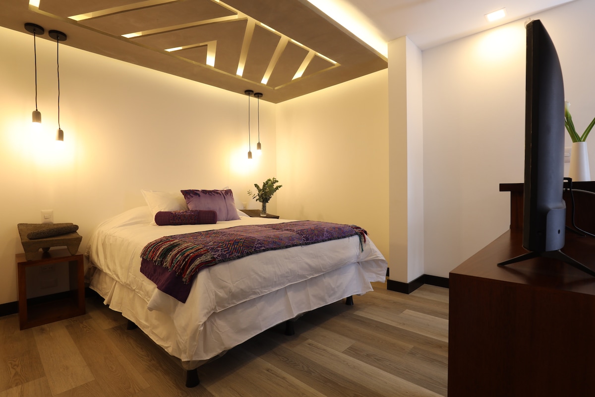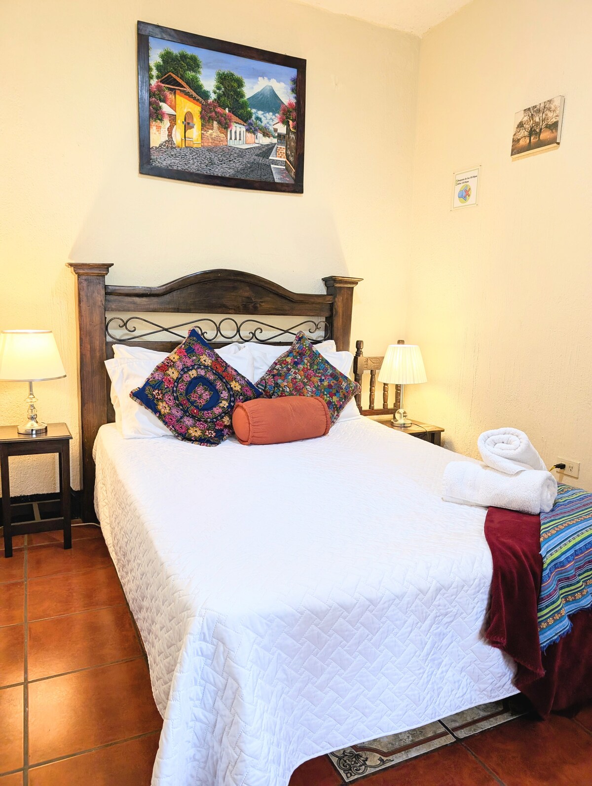 Habitación moderna en céntrico hotel boutique en la ciudad de Guatemala. La habitación cuenta con una cama Queen, aire acondicionado, TV Smart, closet y baño privado. Capacidad 2 personas. El hotel boutique cuenta con recepción las 24 horas, parqueo gratis para un vehículo dependiendo disponibilidad, terraza, jardín y se encuentra en la zona 10, una de las mejores zonas de la ciudad. A 5min de Oakland Mall y de la zona viva. Ofrecemos traslado del aeropuerto por Q40 por hasta 5 personas.