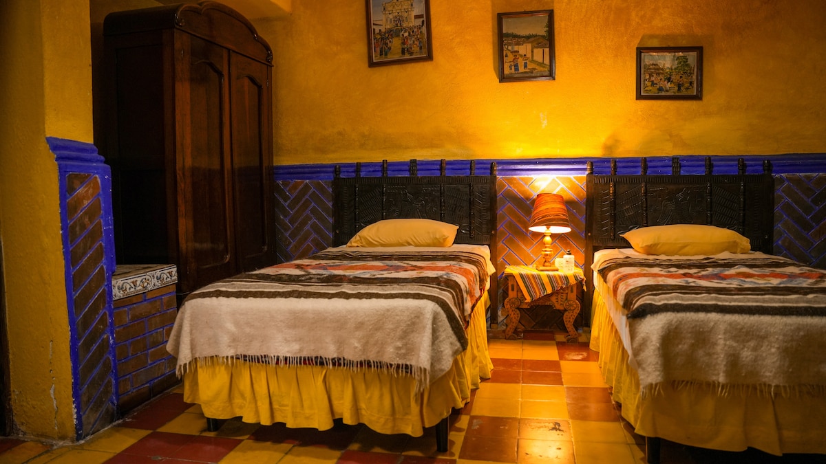 Nebaj se encuentra en el Triángulo Ixil, en la Cordillera de los Cuchumatanes. Su nombre significa "lugar donde nace el agua". Esta suite está inspirada en los ríos y cascadas que rodean la ciudad, y en el huipil tradicional que usan las mujeres, que comúnmente es marrón con patrones de pájaros brocados. Consta de dos habitaciones individuales con sala y pequeña cocina compartidas.