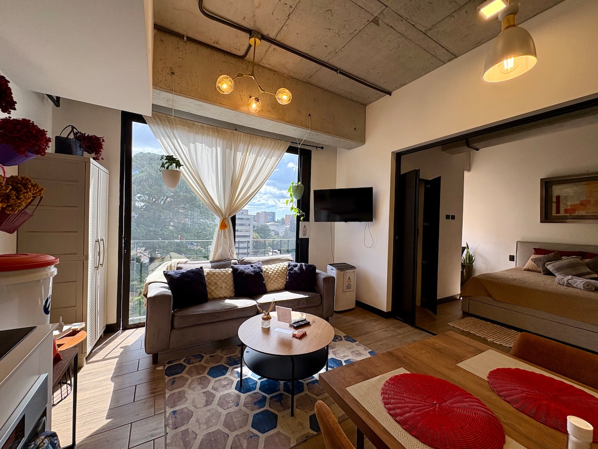 Vive en este espacio tan tranquilo y elegante. Vive la experiencia de alojarte en un apartamento tipo loft completamente nuevo en el bello país de Guatemala. Nuestro apartamento con toques modernos, elegantes que acompañan de una vista sin igual, brindan calma y tranquilidad en una de las zona más exclusivas de nuestro país. Tendrás la oportunidad de alojarte cerca de centros comerciales, restaurantes, zona hotelera y a pocos minutos del aeropuerto internacional.