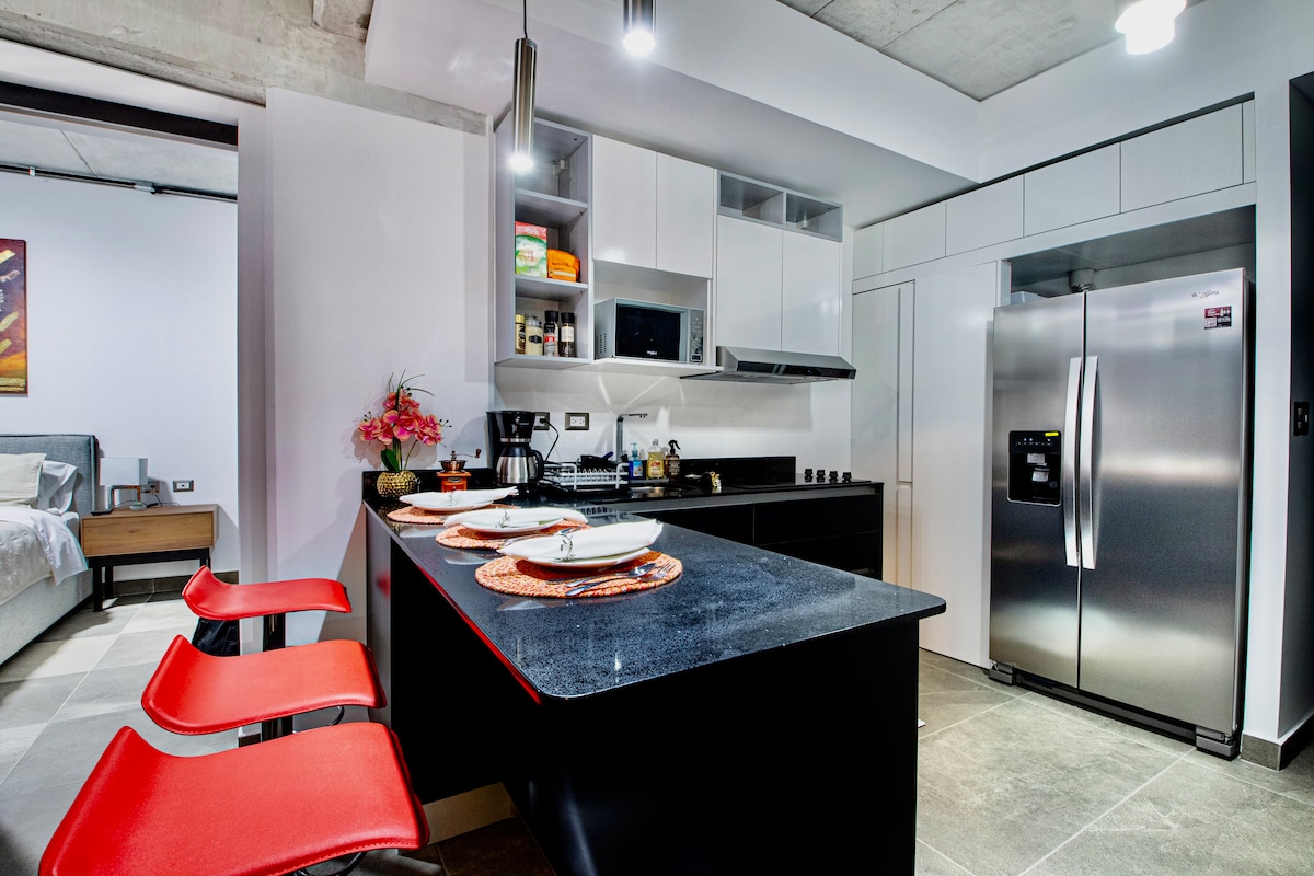 1-bedroom bright, clean and modern apartment close to Cayala/US Embassy. Lots of amenities on site including a lap pool, gym, garden, spa and wine cellar. Coworking and private meeting rooms are available upon request. internet, working area and fully equipped kitchen. Rooftops with great views. Walking distance to a great restaurants, grocery store, nigtlife, sports and shopping in the must see area of Cayalá. WALKING DISTANCE TO CONCERTS. Safe neighborhood. Short/long stays.