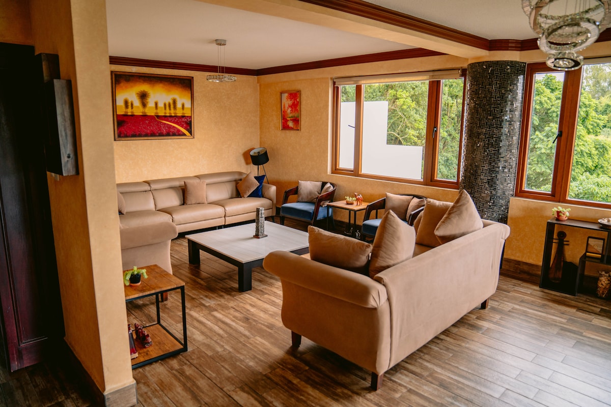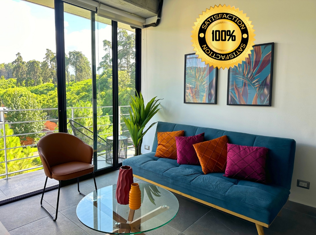 Luxurious new Apartment at the most exclusive zone of the city, Zone 15, with security check points in all 3 differents access gates. Exquisitely furnished and decorated with all high quality amenities included, like high speed 160MB Wifi Internet connection and Digital Cable TV. Free Gym and Sauna available. King size bed and a 75" Smart TV and a 24,000 BTU Air Conditioning unit. Balcony with a view from your hammock of the Pacaya volcano and the city skyline. 10 minutes away from Paseo Cayalá.