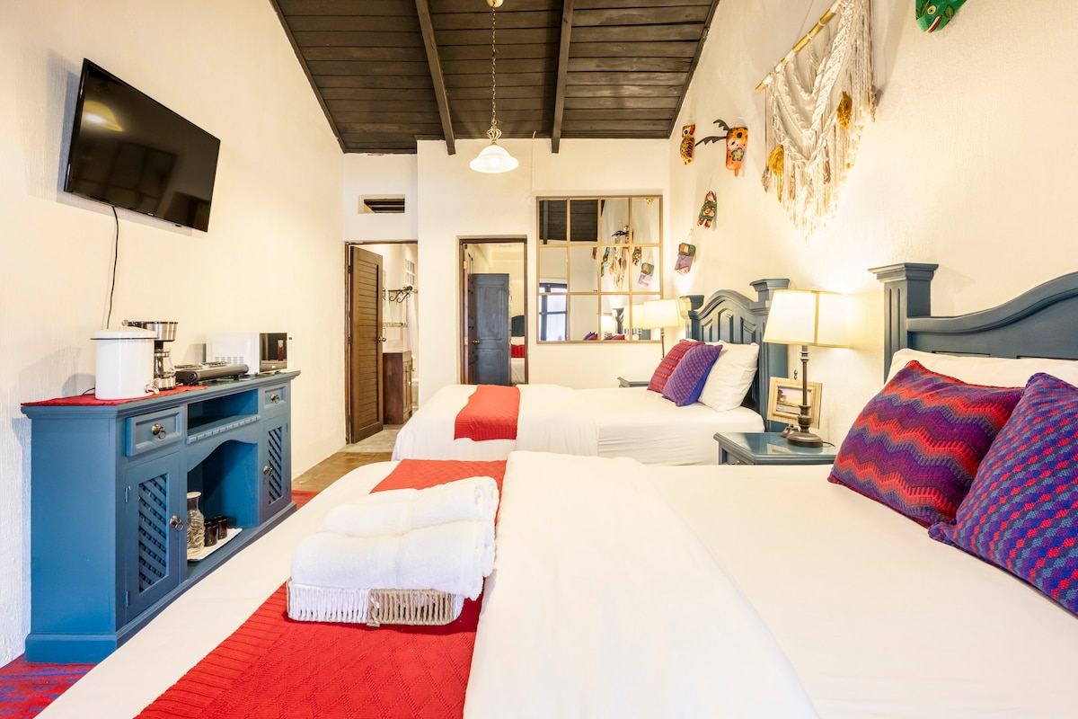 Spacious and comfortable room at El Carmen Hotel located in the center of the city just 1.5 blocks from the central park The room has 2 double beds, a private bathroom, cable TV, hot water, air conditioning, toiletries, and access to our rooftop with spectacular views of Antigua. Free breakfast and parking are included. *BECAUSE THIS IS A HOTEL ROOM YOU WILL BE ASSIGNED ANY OF THE DIFFERENT ROOMS IN THE PICTURES*