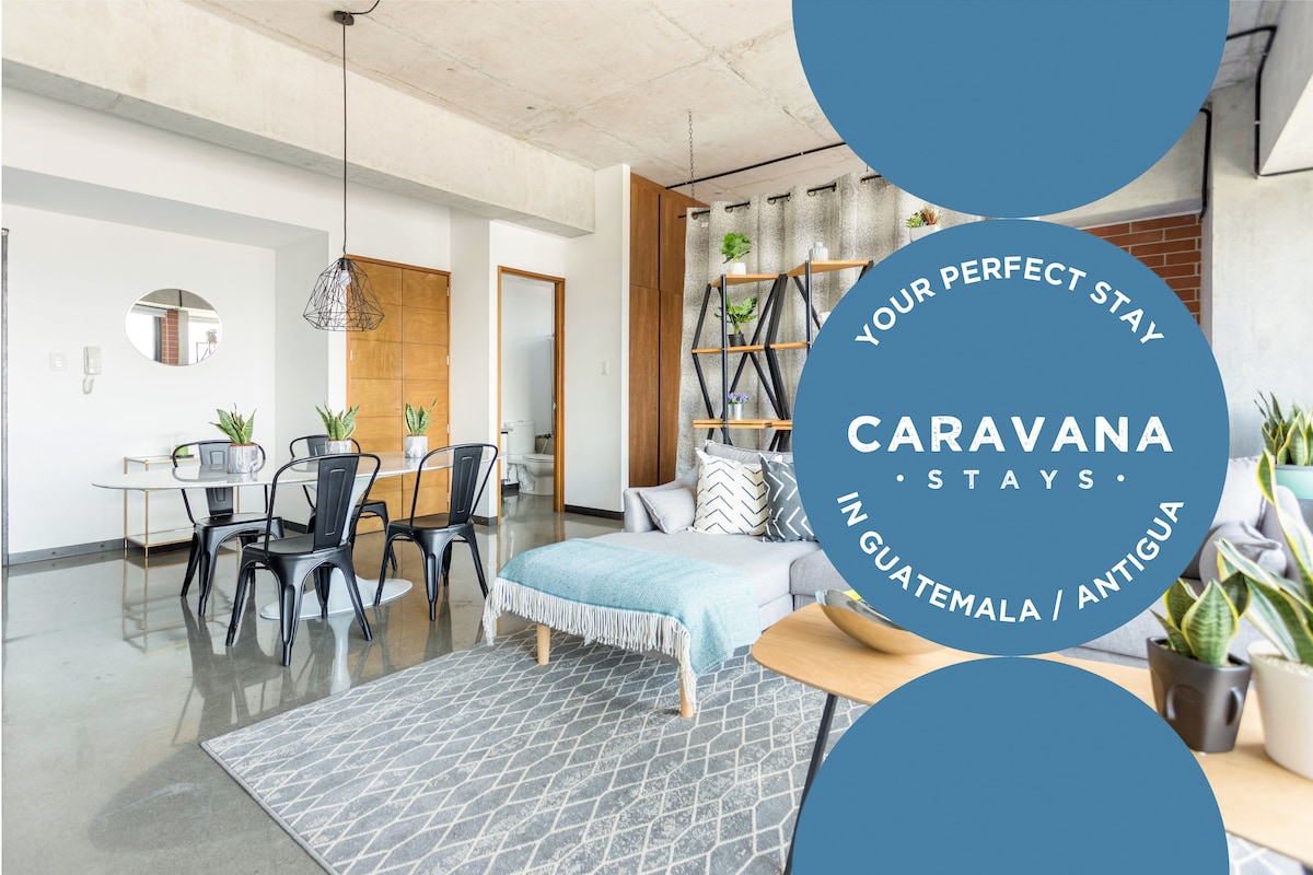 ★NO AIRBNB SERVICE FEE!!★ Exclusive benefit for CARAVANA guests ★GUATEVIDA★ CITY APARTMENT IN TRENDY ZONE 4 Feel the experience staying in Guatevida city apartment with a boho decor in a industrial style building, located in new trendy zone 4 of Guatemala City. You will have the opportunity to stay near walk friendly streets and lots of trendy restaurants and cafes. Guatevida apartment has common amenities that are a truly privilege to use like gym and a beautiful skydeck.
