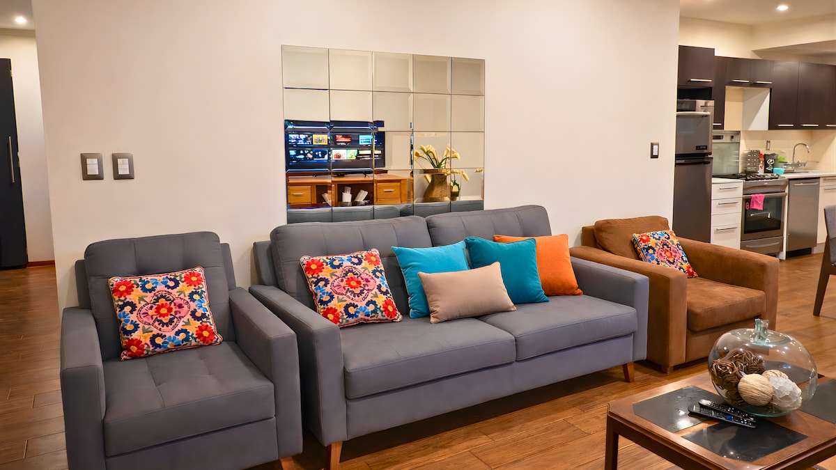 Relájate en este espacio tan tranquilo y elegante. Disfruta de una experiencia con estilo en este alojamiento en la mejor area de la ciudad, a pocos metros del aeropuerto. Con un balcon con jacuzzi y chimenea, nuestra suite de lujo tiene una vista impresionante a la ciudad. Es una muy buena opcion para ti para quedarte, tiene un estilo moderno, area para home office, nunca te aburriras mientras trabajas, conocelo!!