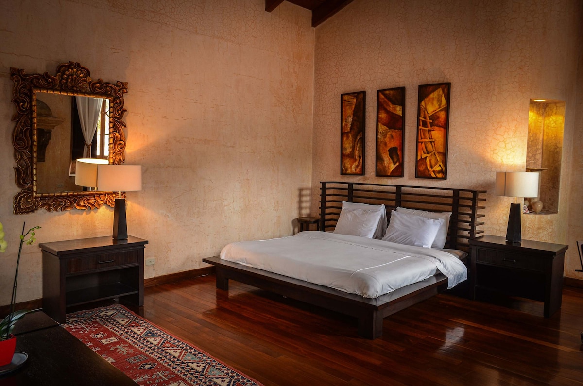 Unveil enchantment in our boutique 5-room hotel, where Baroque artistry adorns every corner. The master suite, our grandest offering, boasts bespoke service by a personal groundskeeper. Wander lush gardens in a secure gated community, savor twilight on the rooftop with vistas of Antigua's volcanoes. A historic gem fusing opulence and charm, promising an unmatched escape. Secure the epitome of luxury and antiquity now.