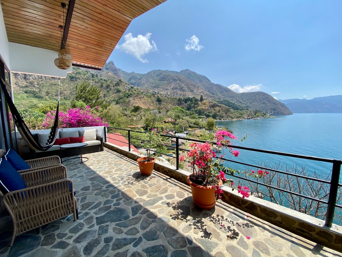 This brand new modern home is lakefront to Lake Atitlan Guatemala, the most beautiful lake in the world. Powered only by the sun, this green energy home has 3 bedrooms and 3.5 baths with a large hot tub, futbol (soccer) field, and modern dock. Come to relax and get away, and/or get some work done with highspeed Starlink internet with a powerful mesh wifi network. Residential area, yet only 5 min walk to restaurants/bars. The solar only heated hottub is not hot on rainy or cloudy days.