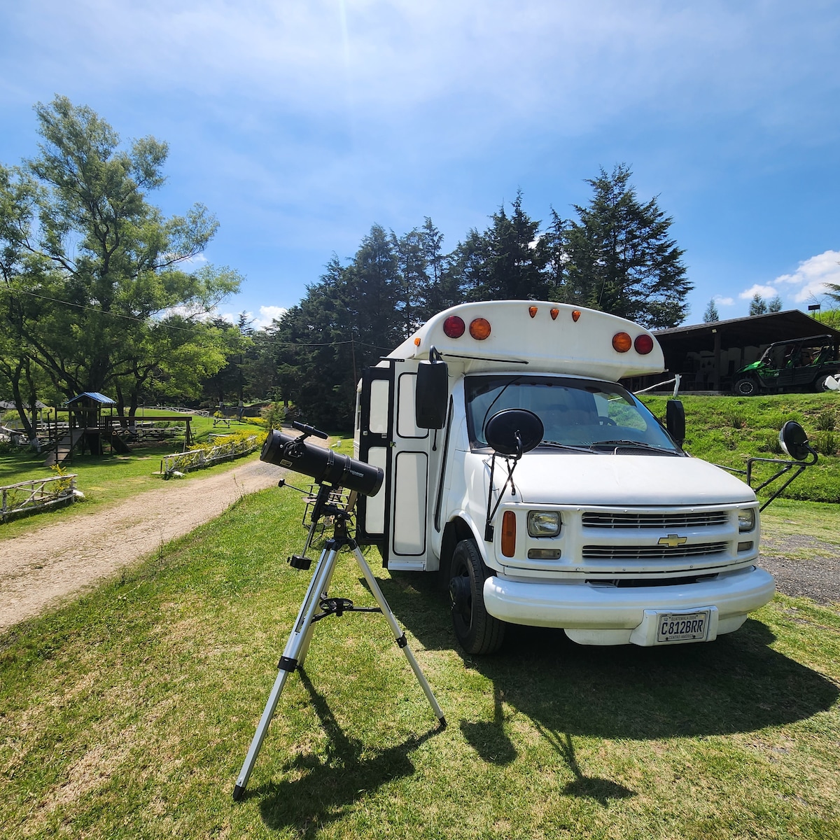 A different kind of hotel! A chicken bus established in the forest that can handle up to 5 people with all the commodities. Ceiling and walls covered with cypress wood, a little kitchen, water filter and a table outside for eating. All this surrounded by a beautiful forest with tall trees where you can find a zipline (extra charge), a little river and a lot of different animals and plants. Here you have a restaurant that can go eat there or ask for room service.