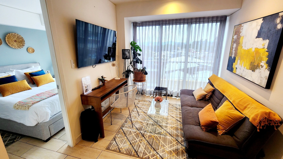 Welcome to Blue Skyline, a modern and cozy apartment located in the QUO Building, ideal for relaxing or working. Enjoy a pleasant city view and a strategic location near Cuatro Grados Norte, restaurants, cafés, and corporate areas, and just minutes from Zone 1 and La Aurora International Airport. Perfect for practical stays and business trips.