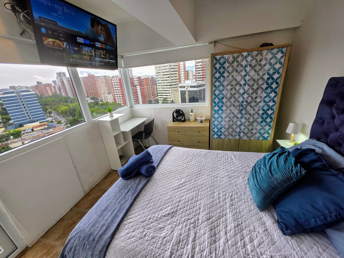 Disfruta de este encantador apartamento pequeño tipo estudio con aire acondicionado portatil de ventana y vistas impresionantes al volcán de Agua desde el balcón. Ubicado estratégicamente en el corazón del distrito comercial y empresarial de Guatemala, a solo 15 minutos del aeropuerto. Este apartamento te ofrece una experiencia única, rodeado de una amplia variedad de restaurantes, bares y centros comerciales para que disfrutes al máximo tu estadía.