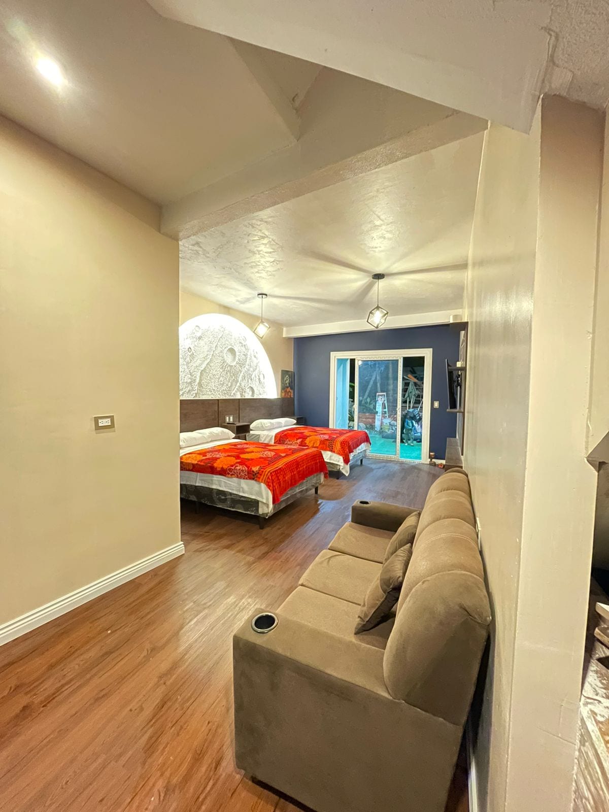 Adults only Vulkana Apartment – Design & Stunning Fuego Volcano View Two-story apartment in the luxurious Vulkana Resort near Antigua. Enjoy modern jungle design, with living room, kitchen & bathroom downstairs, and a bedroom upstairs with breathtaking volcano view. Access to resort areas included. Perfect for couples or travelers seeking peace, style & nature. 24/7 security, Wi-Fi & parking included.