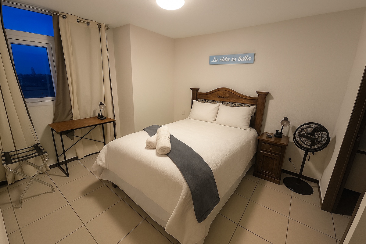 ¡Estrena este moderno apartamento en Zona 14! A solo 10 minutos del aeropuerto, con una ubicación privilegiada cerca de restaurantes, Cayala, malls , la mejor vida nocturna. Hospitales. Disfruta de 24 amenidades exclusivas, incluyendo gimnasio, piscina, rooftop, salón social y seguridad 24/7. 1 habitación con AC+ 1 sofacama en sala , cocina y baño equipado, WiFi rápido, Smart Tv, lavadora/secadora 2 en 1, vista al interior del complejo, 1 parqueo privado. De 4 noches o +,recibe 1 botella vino