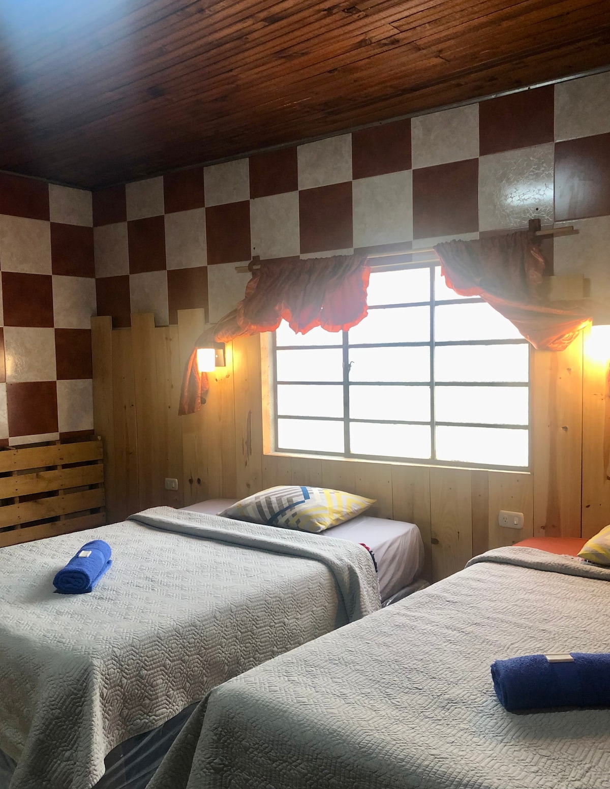 Cómoda habitación privada con baño privado externo. Cuenta con una cama queen size y una litera , para un máximo de 4 personas. El hostal cuenta con áreas sociales tales como: jacuzzi , BBQ, sala con TV y mesas al aire libre.