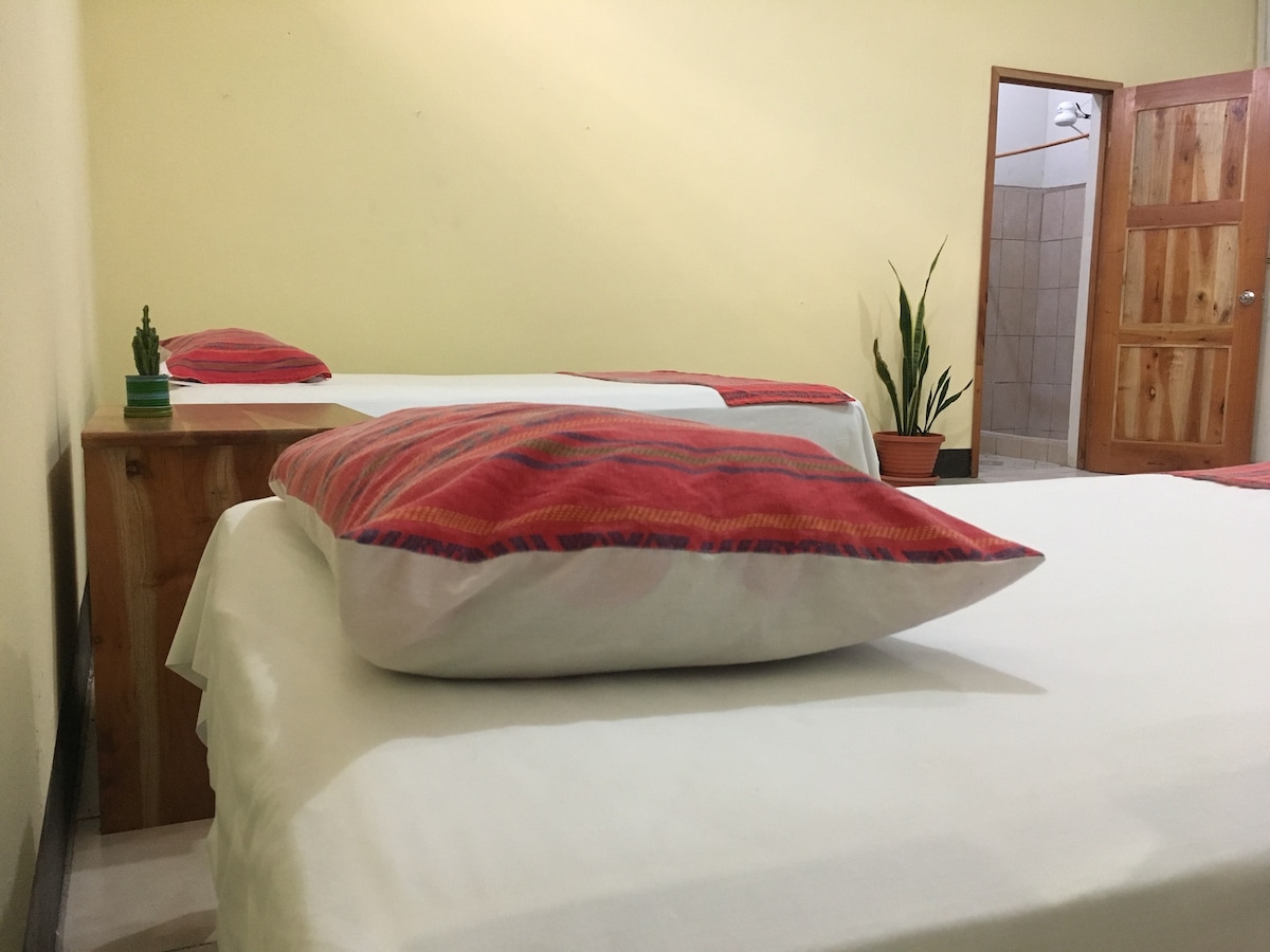 One of 8 comfortable rooms, located in central Panajachel, 5 minutes walk from the Santander street. Surrounded by beautiful gardens, access to a pool adjacent to the rooms which also boasts a lively pool bar, with music, that is open to the public during the day. On site, we have a pizzeria and delicious desserts! The hotel and pool are reserved for adults (+18 years old). No exceptions.