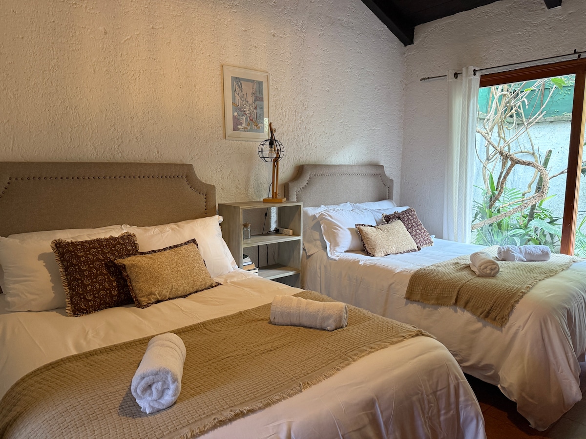 Set in a coffee lot by a unique wetland area, this home is about twenty minutes away from Antigua. Still, it feels a world away. You'll spend peaceful days in the lush gardens and walk to the Mayan towns of San Antonio and Santa Catarina Barahona. Should you like, you can also get to know the kids who visit the "Caldo de Piedra" library next door. (Proceeds go to support it.) Pickup and drop-off from Antigua is provided (weekdays, up to 6 pm.-restrictions apply) Nature-, book-friendly.