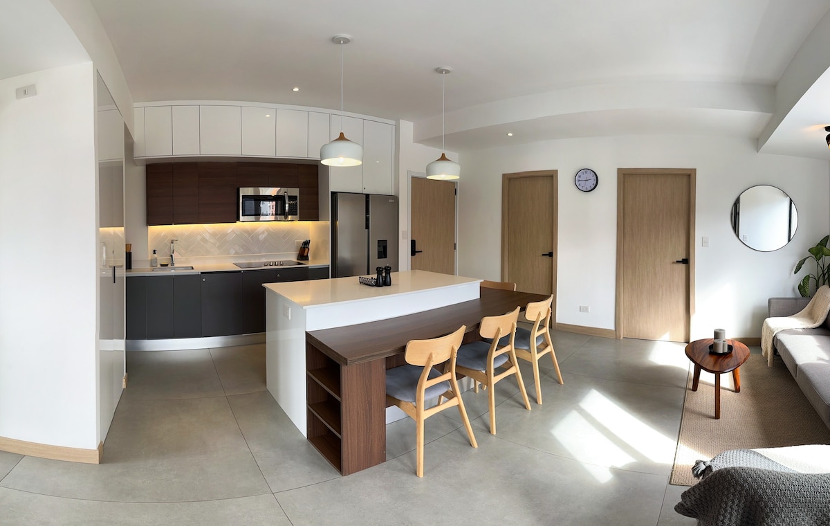 Located in one of the safest, vibrant, active, most walkable & convenient areas in Guatemala City with all the comforts of this spacious and bright apartment. A cozy space, carefully designed and with everything you need to have a perfect stay. Capacity for 5 guests, with two bedrooms with private bathroom each and one sofa-bed, large main room, private balcony, full kitchen, one parking and access to the beautiful amenities of the building: office work space, terrace with pool, gym, gardens.