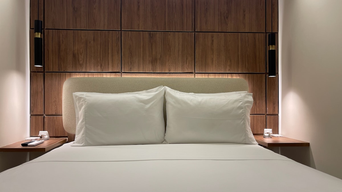 Con un amplio espacio de 23m2, cuenta con una acogedora alcoba, una zona de entretenimento perfecta para relajarte, un balcón para disfrutar de una espléndida vista, cocina equipada, un cómodo escritorio para trabajar; amplio vestier para organizar tus pertenencias, lencería de calidad y un baño completo para tu comodidad. Cuenta con cajilla de seguridad, plancha y mesa para planchado.
