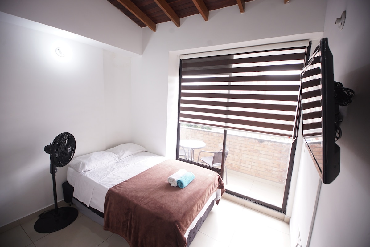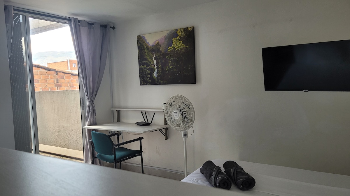 Loft 43 Medellin Increible apartaestudio Ideal para quienes disfrutan trabajar desde cualquier lugar. Cuenta con una cama Queen Size, escritorio y silla de trabajo, cocina integral dotada, baño privado con ducha de agua caliente, televisión de 43 y conexión WIFI. Los elementos básicos de cocina puedes solicitarlos en recepción, Aceite, vinagre Sal y pimienta puedes comprarlo en en una tienda cercana. Para registrarse es necesario presentar un documento de identificación fisico válido.