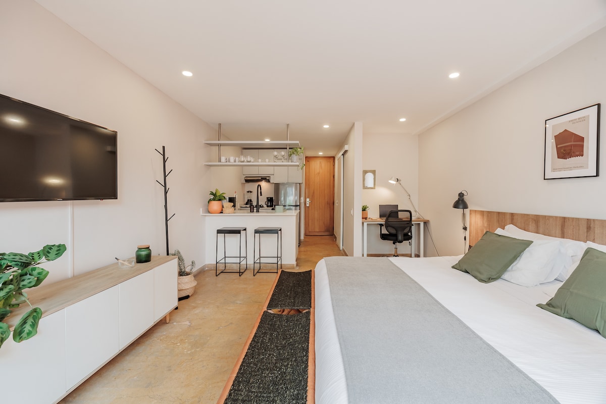 • Amazing location in heart of Poblado: "Oasis in the middle of the best part of the city, walking distance to everything” • Modern, comfortable fully furnished Loft • High speed 200 Mb WiFi Fiber Optic • Loads of nature around • Private outdoor patio • A/C • Pool + Hot Tub in common areas • 5 mins walk to best restaurants, cafes, malls. 22 mins walk to Poblado and Lleras Park • Fully stocked kitchen • 43" Smart TV w/ all Apps • Transparent prices: No service or cleaning fee • On site 24/7 staff