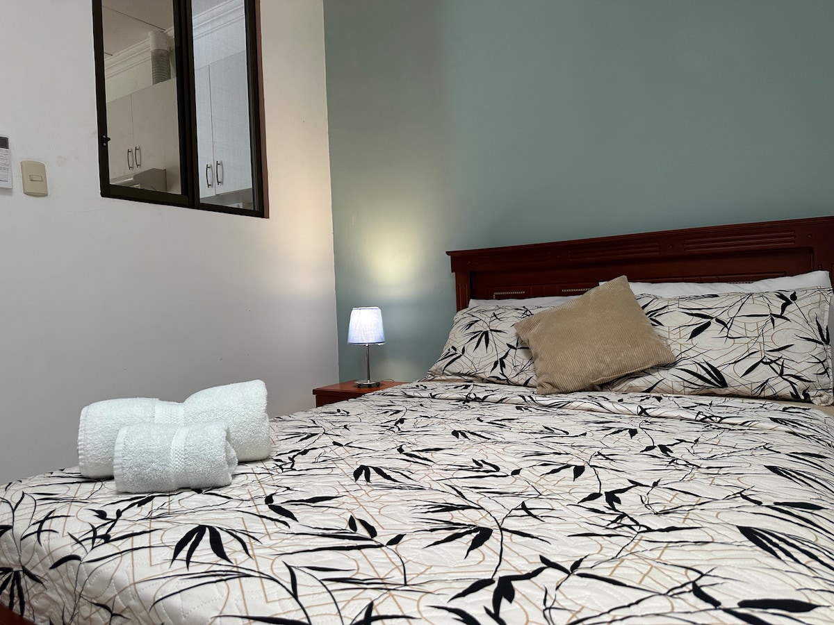 - 100% privado - Patio interior - A 17 minutos de Consulado Americano, 12 min de Aeropuerto, 7 min de Sanmarino - 1 Cama Queen + 1 Sofá cama - 2 Smart TV e internet - Cocina americana - Check in: 15h00 Check out: 11h00 - Cédulas/pasaportes requeridos - Parqueo privado gratis en Plaza Guayarte, frente al condominio, resguardado. Horarios: Dom a Juev: abre 6AM cierra 12AM Vie y Sáb: abre 6AM cierra 1AM - Estacionamiento sin guardiania: Frente a la entrada principal. (1 espacio)