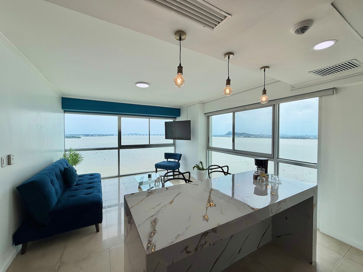 The apartment has been completely renovated. White is the predominant color in the apartment giving the sensation of amplitude and freedom. Decoration is minimalistic, with wood like finishes on the floor, teak doors, beds and nightstands. The view is amazing overlooking Santa Ana Hill, the Guayas River and the city. There is 24h reception in the building, and security cameras everywhere, very safe area and building.