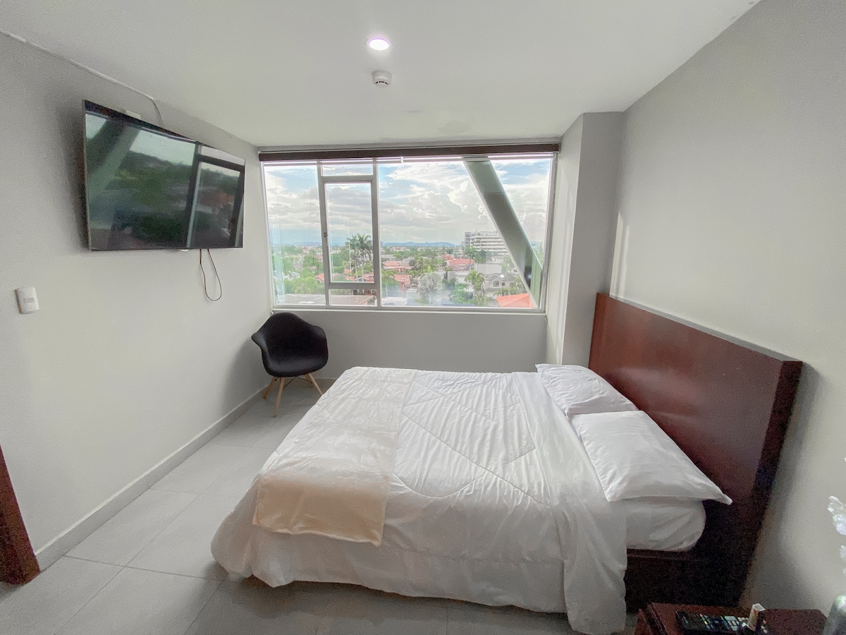 Ubicados en la via a Samborondon dentro de una urbanización privada. La Suite esta compuesta por una cama de 2.5 plazas (Queen Bed). El televisor es de 40 pulgadas (nexflix incluido). caja fuerte, baño privado con agua caliente y aire acondicionado. El edificio cuenta con parqueo privado y wifi en todas partes. Tiene acceso a una terraza con mesas y sillas Solo alquilamos a un solo pasajero (no aceptamos dos personas en la reserva). se prohiben visitas de cualquier tipo.
