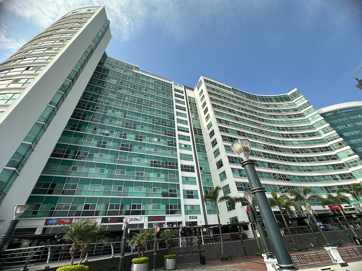 Enjoy the elegance and comfort of our suite in the exclusive area of Puerto Santa Ana, surrounded by excellent restaurants, cafes and outdoor spaces just a few steps away. In addition, you will have access to our social area with a pool, sauna, jacuzzi and gym, with impressive views of the Guayas River so you can relax and have fun during your stay.