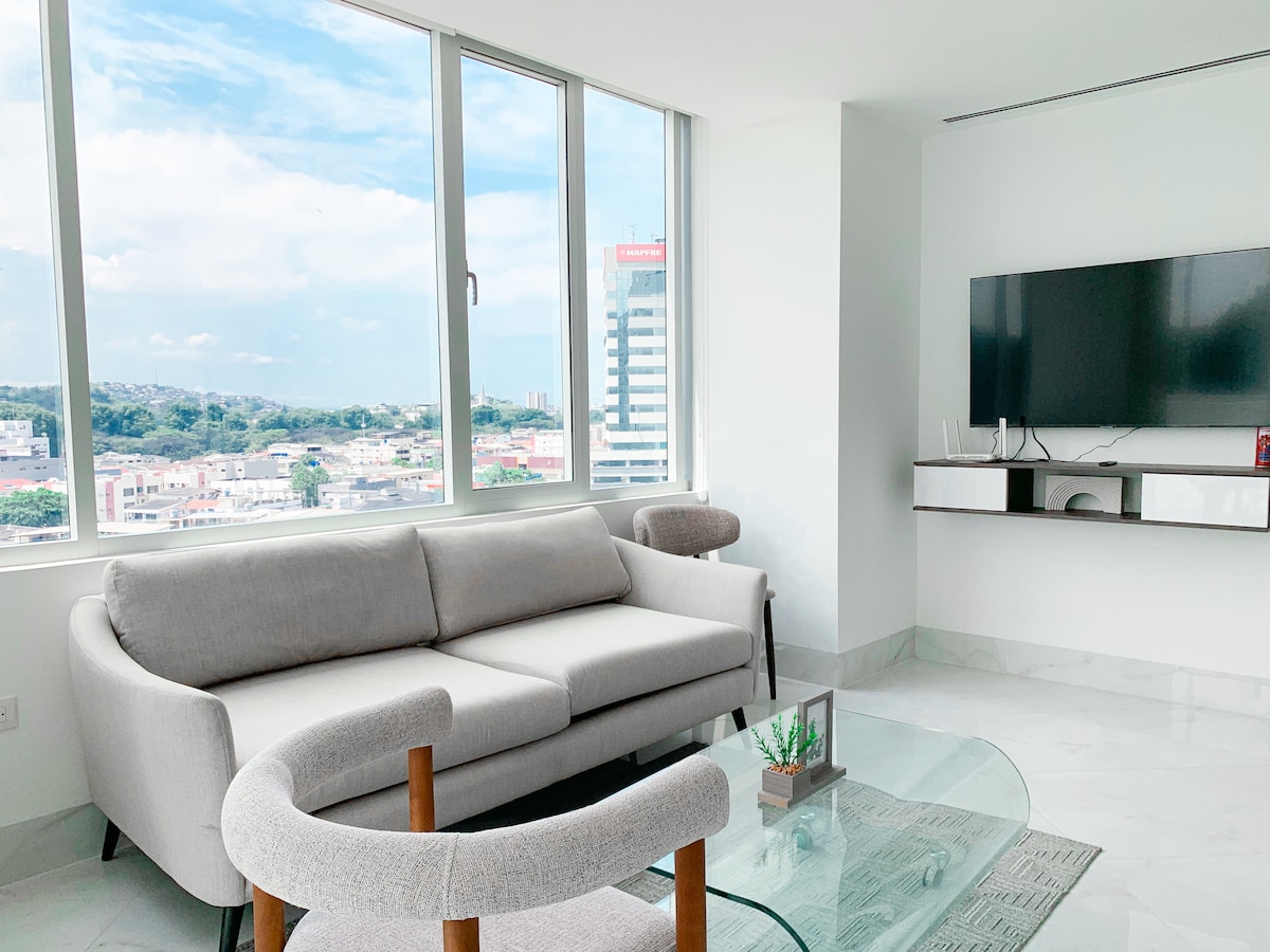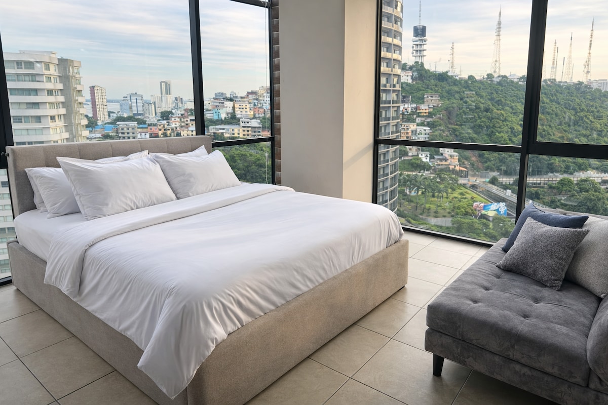 Cozy 2-room suite with a panoramic view of the Guayaquil Lighthouse. It features a living room with a sofa bed (sleeps 2), a bedroom with a double bed, and a private bathroom (only one bathroom, shared if the sofa bed is used). Ideal for 2 guests, with capacity for up to 4. Located in the best residential and commercial area, close to the airport, bus terminal, restaurants, and supermarkets, with 24/7 security and concierge service. Swimming pool Jacuzzi Sauna Fully equipped gym