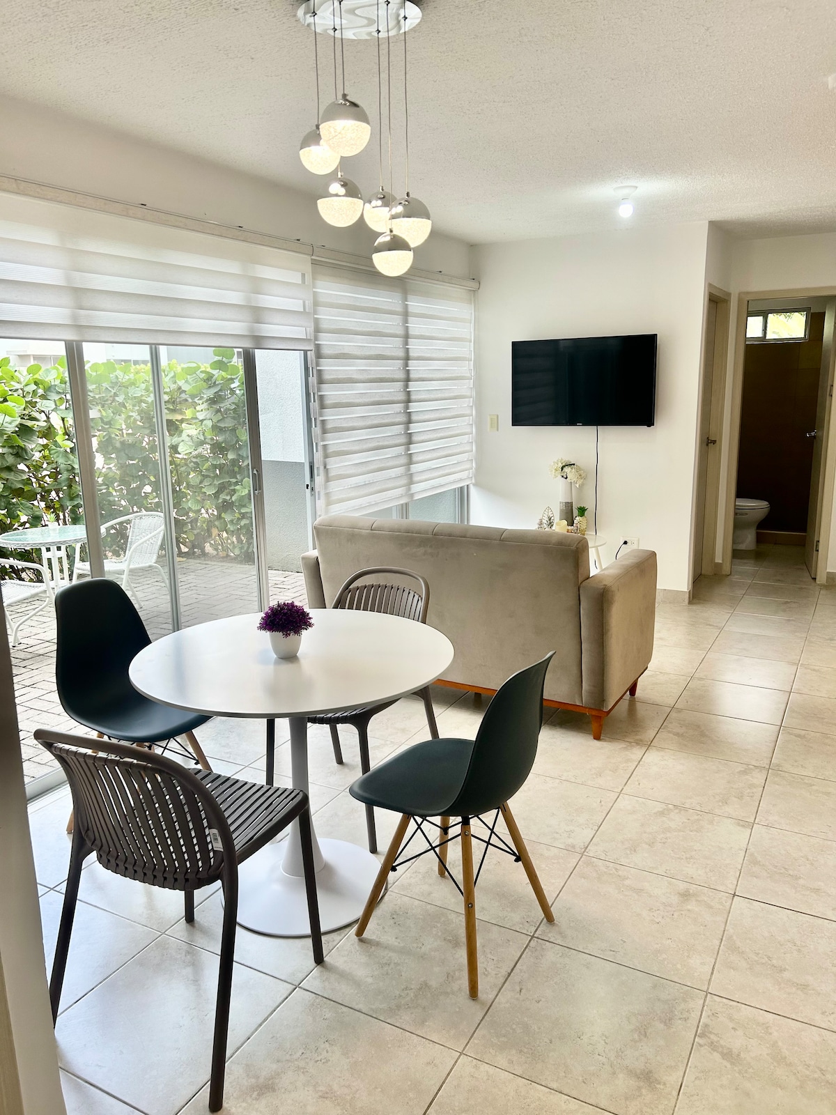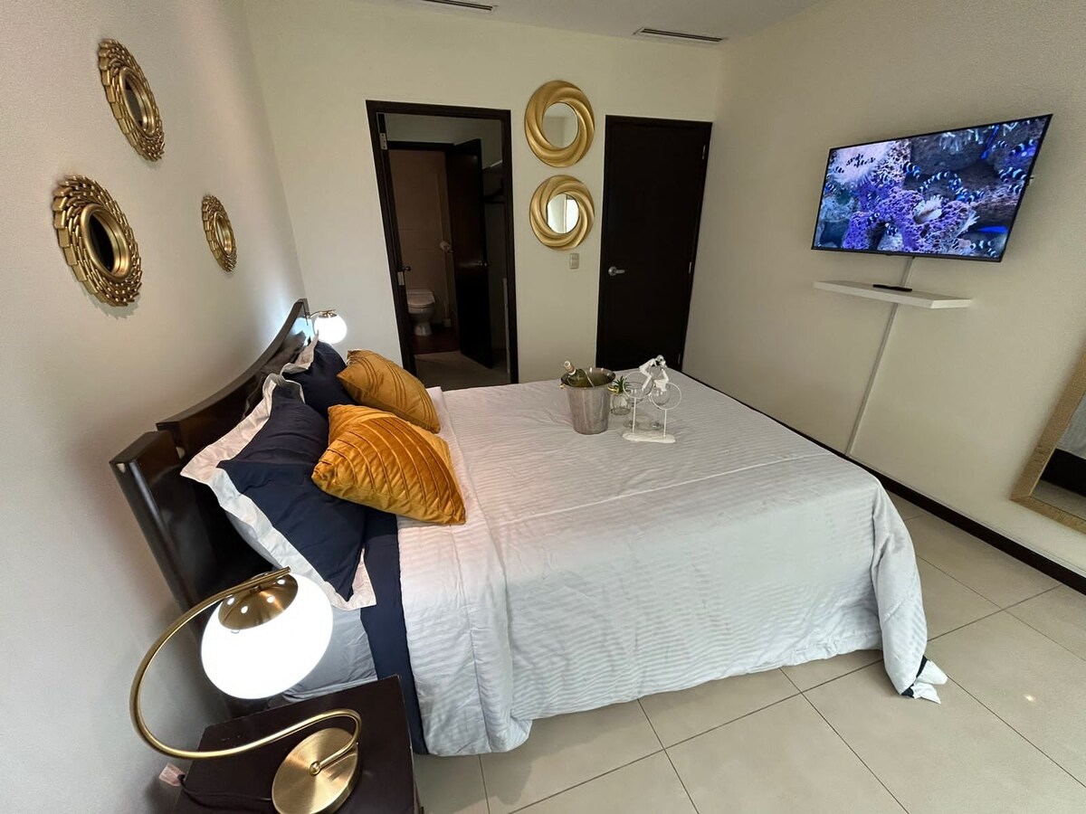 Modern suite in Riverfront 2 – Puerto Santa Ana, with river views, ideal for leisure or business trips. Features a very comfortable King-size bed and a sofa bed in a modern, bright space. Includes Smart TV 55” in the living room and 40” in the bedroom, Netlife Wi-Fi, air conditioning, fully equipped kitchen, washer, and 24/7 security. 🏊💪 Pool and gym available according to building hours. 🚗 Parking included at Santana Park, across the street. Located next to Wyndham Garden Hotel.
