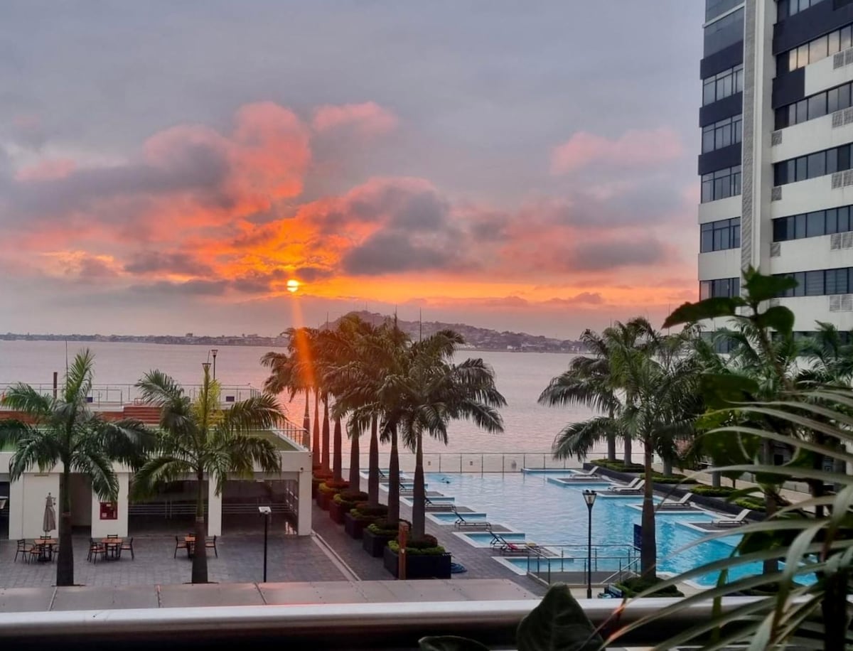 ✅ Hermosa suite en el piso 8 del Edificio River Front #1, con un balcón espectacular y vista panorámica al sector Puerto Santa Ana. 🛏️ Cama King (3 plazas) con sábanas 100 % algodón y sofá cama de 2 plazas, ideal para disfrutar en pareja o familia. 🍳 Cocina equipada, lavadora/secadora, agua caliente, Internet, DirecTV y parqueadero subterráneo. 🏊♂️ El edificio ofrece seguridad 24/7 y amenidades: piscina, jacuzzi, sauna y gimnasio. ✨ A solo 10 minutos del aeropuerto.