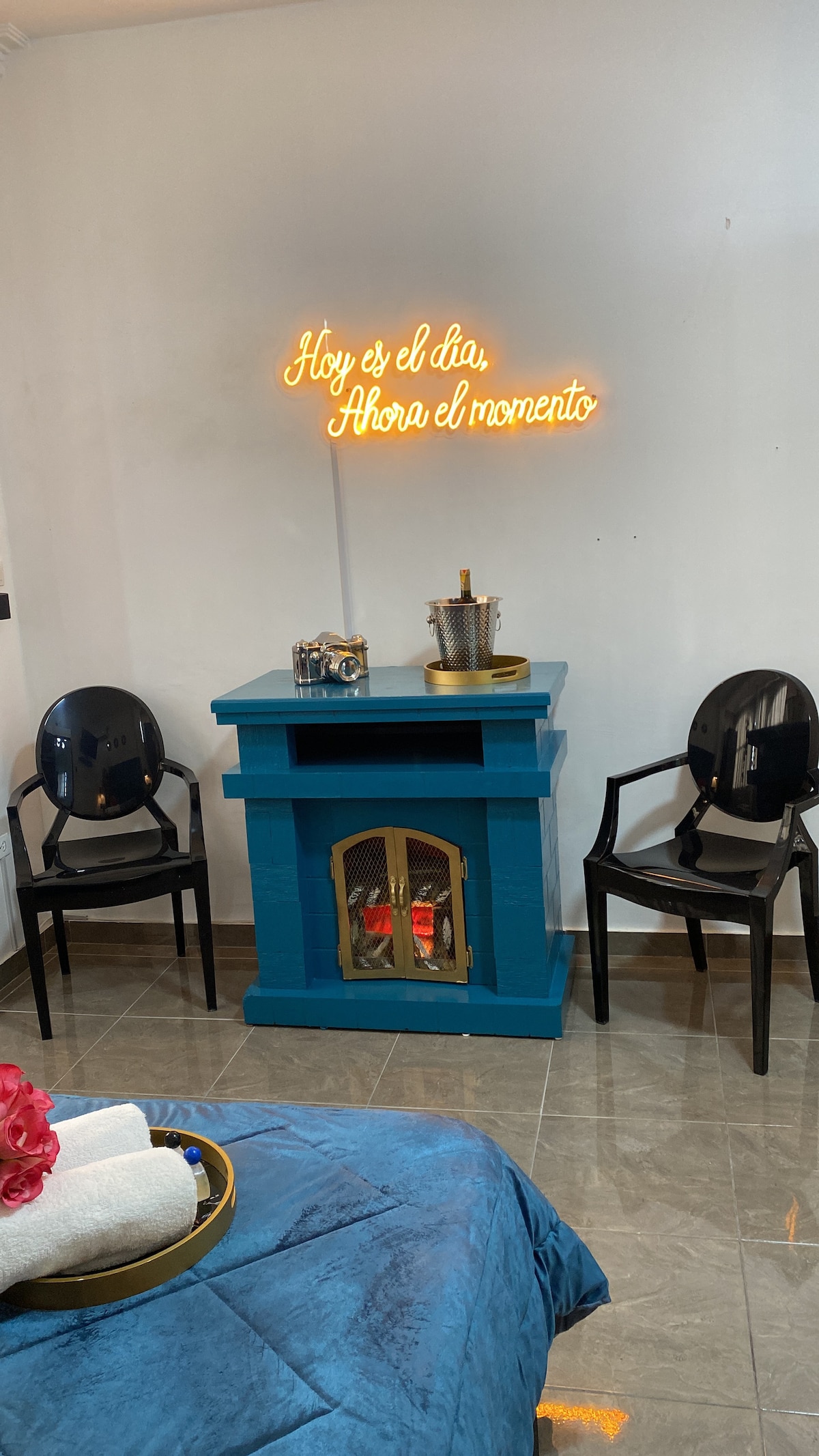 Ubicada en un condominio seguro, esta suite ofrece una experiencia única con una decoración moderna que incluye un columpio de rosas y chimenea decorativa. Con cocina totalmente equipada, área de trabajo, Wi-Fi, es perfecta para turistas, nómadas digitales, parejas y viajeros de negocios. Ubicada sobre una avenida principal, frente a un mall con tiendas y restaurantes, a solo minutos del aeropuerto, terminal de buses y centro turístico. Disfruta de recepción 24/7 y servicio de lavandería.