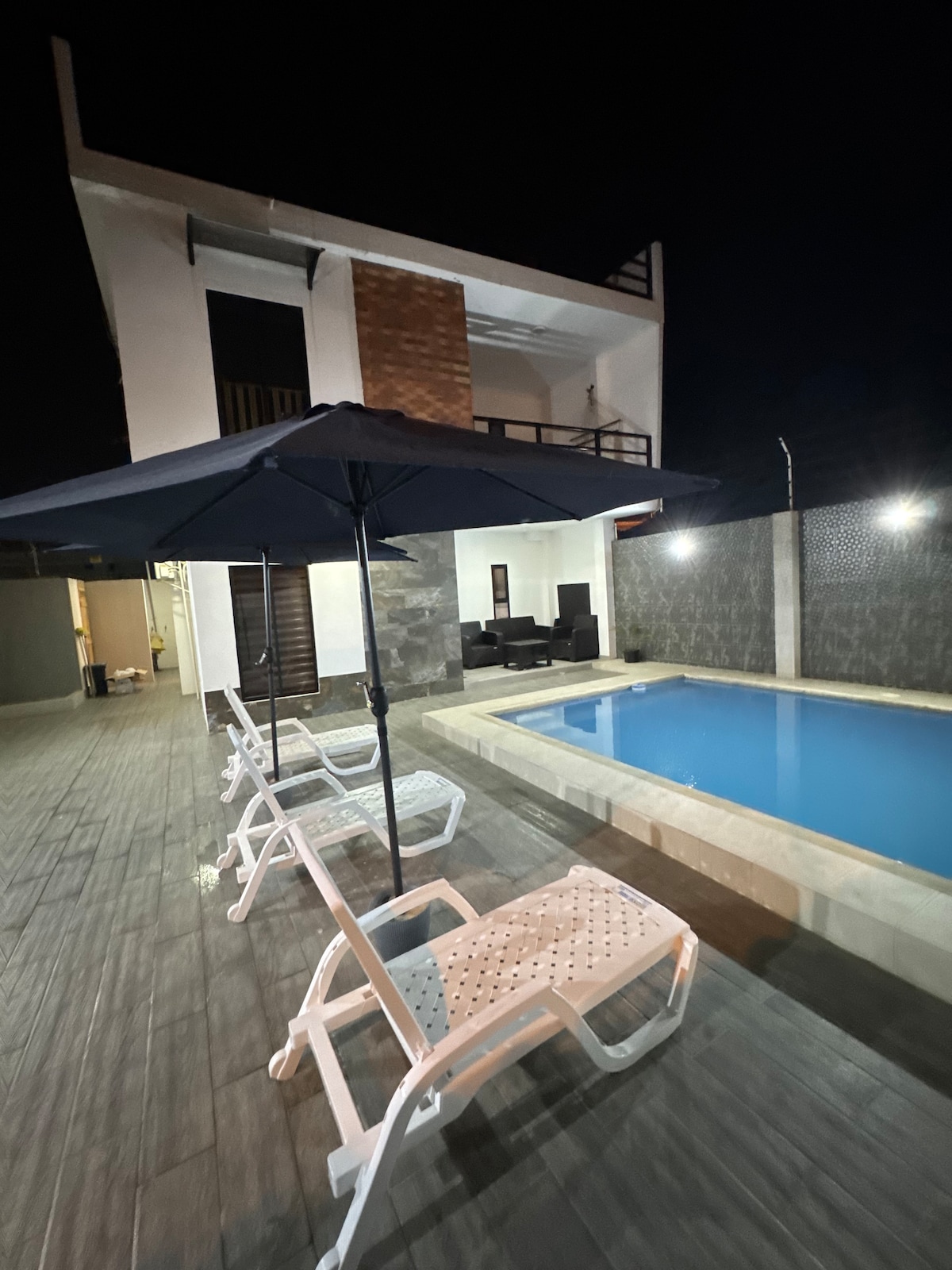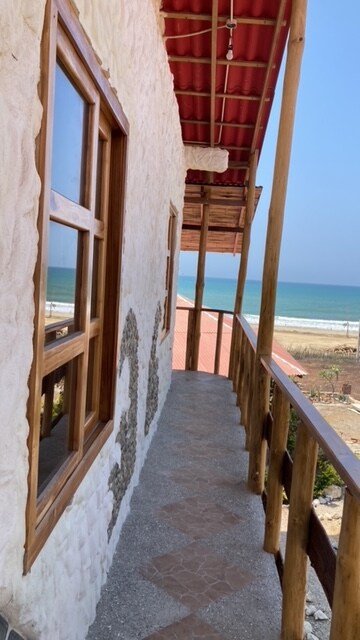 Completely furnished beach front studio style house, with Queen size bed, 2 single beds for 4 guests. There is room to accommodate 2 extra guests on floor mattress or an exrta full size bed for a total of 6 guests. Villa has full kitchen, bathroom with hot shower, dinning area TV and cable for stays of 3 days or more. Kitchen is equipped with stove, fridge, dishware and pots and pans for preparing meals. This clean and comfortable rental is located in a quiet, safe, uncrowded area, ideal for couples and families. Wi Fi internet access is available 24/7, cable TV, DVD and movies are available. For your convenience we offer breakfast, lunch, laundry service for a fee. Transportation service for short and long distances, day trips and trips of up to 3 days. Local bus stops right in front of property. Easy commute to nearby Shopping malls, movie theater, parks and museums in Portoviejo (30 minutes) or Manta city(40 min). Swimming pool, BBQ grill, ample parking and private dance floor on premise. Enjoy walks on the beach, bike riding, jogging or just relaxing in a hammock. For your comfort and convenience we have our own electric generator in case of power outage, so you'll still feel at home in a foreign country. This is certainly one of the few places where you can enjoy peaceful surroundings, a clean, comfortable ocean view villa, an almost private beach, a nice swimming pool, nearby restaurants, easy access to the city and all at a very reasonable price.
