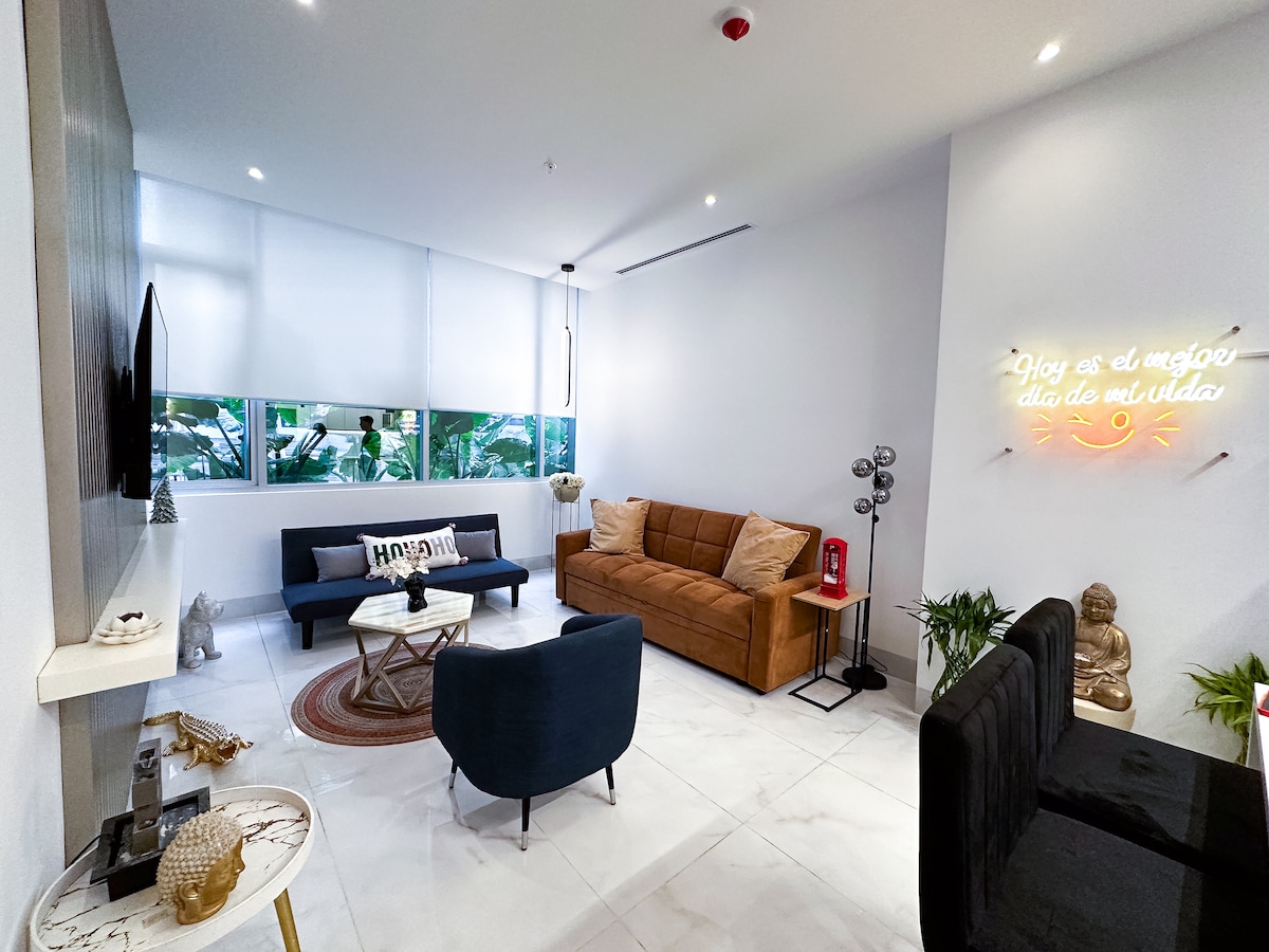 Apartment located in Titanium 1 Building in the housing complex called Millennium City. It is a luxury apartment with comfortable facilities, 1 double bed and 1 very comfortable sofa bed!! The building has a swimming pool, gym, movie theater, squash room and a spectacular view from the terrace! Security is 24/7 throughout the building! Close to shopping centers such as El Dorado Shopping Center and Avalon Shopping Plaza!! Includes ELECTRICAL GENERATOR in the building!!!