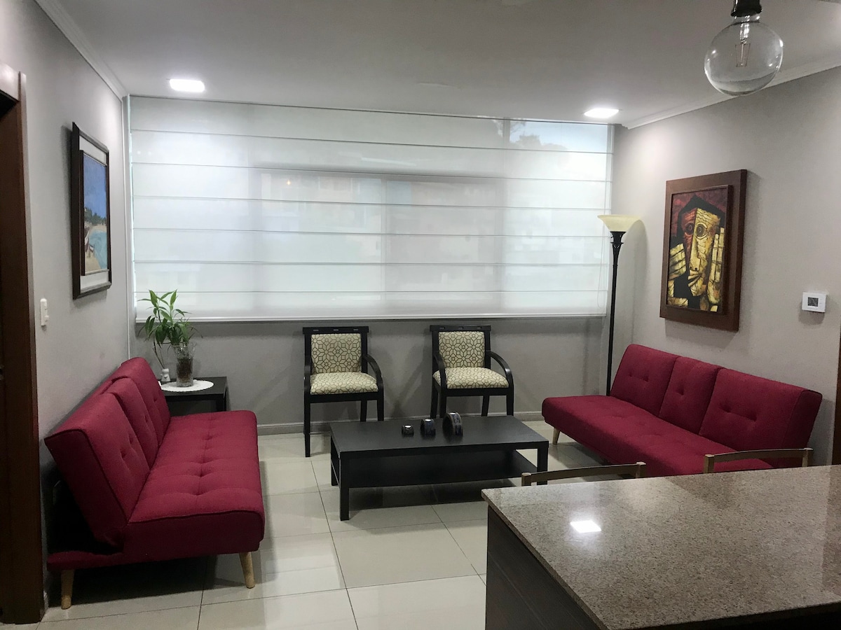 Cozy brand new apartment located in the private sector, ideal for a stay for two people, near the El Dorado shopping center and several supermarkets, located 25 minutes from the Guayaquil airport, it has a private security guard, social area, gym and parks for children. The rental of the apartment is complete, it has air conditioning in the master bedroom, living room and dining room, refrigerator, TV and internet. It is perfect for couples and business trips.